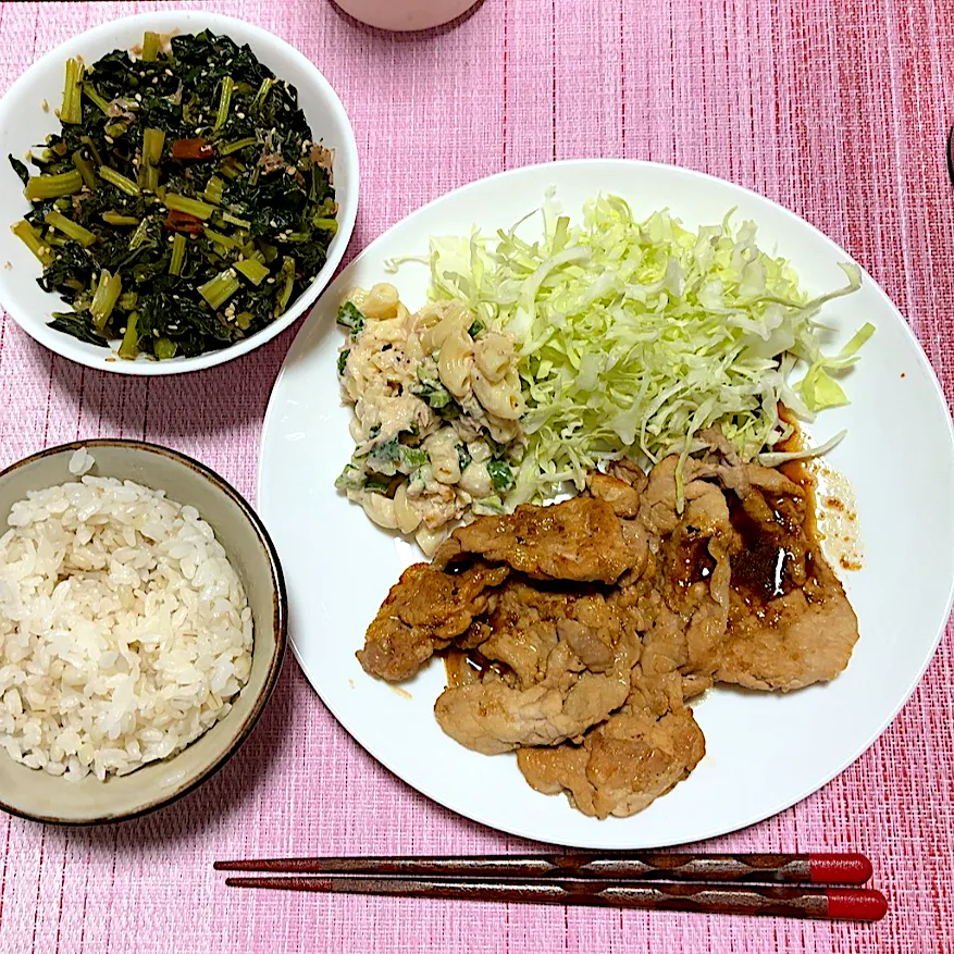 #晩ご飯 #肉料理 #キャベツの千切り #マカロニサラダ #作り置き #もち麦ご飯 #大根の葉っぱ甘辛煮
