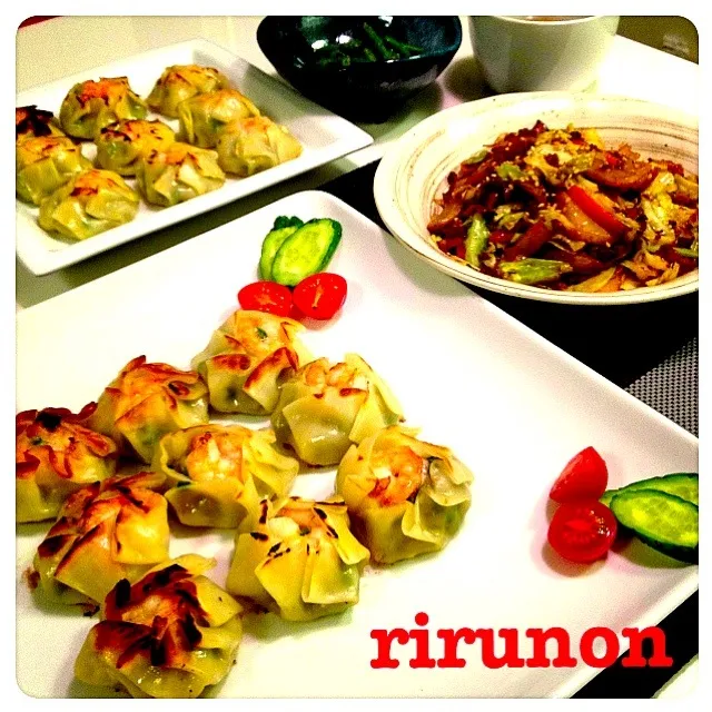 豚ひき肉とニラを合わせたものとエビを餃子の皮で包んで焼きました٩(๑❛ల❛๑)۶