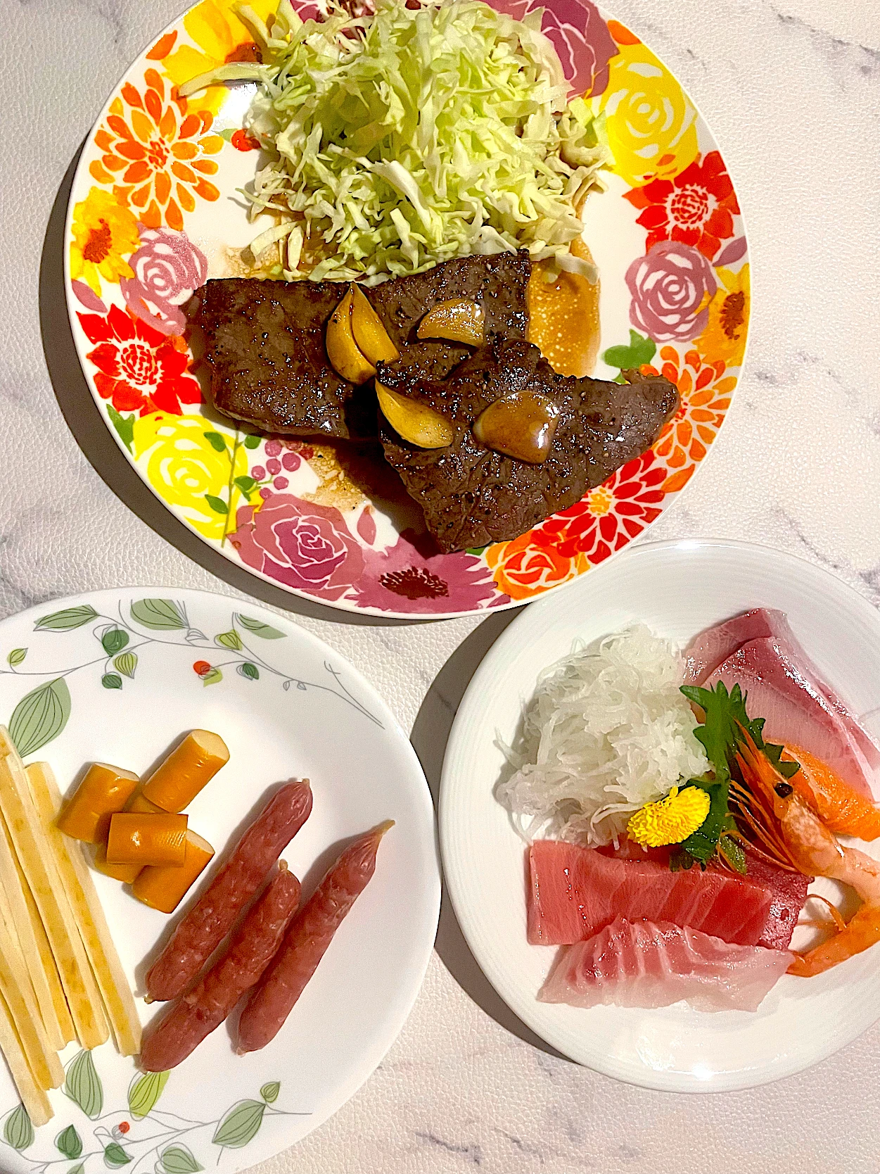 晩ごはんは奮発して国産和牛ステーキとお刺身を用意しました