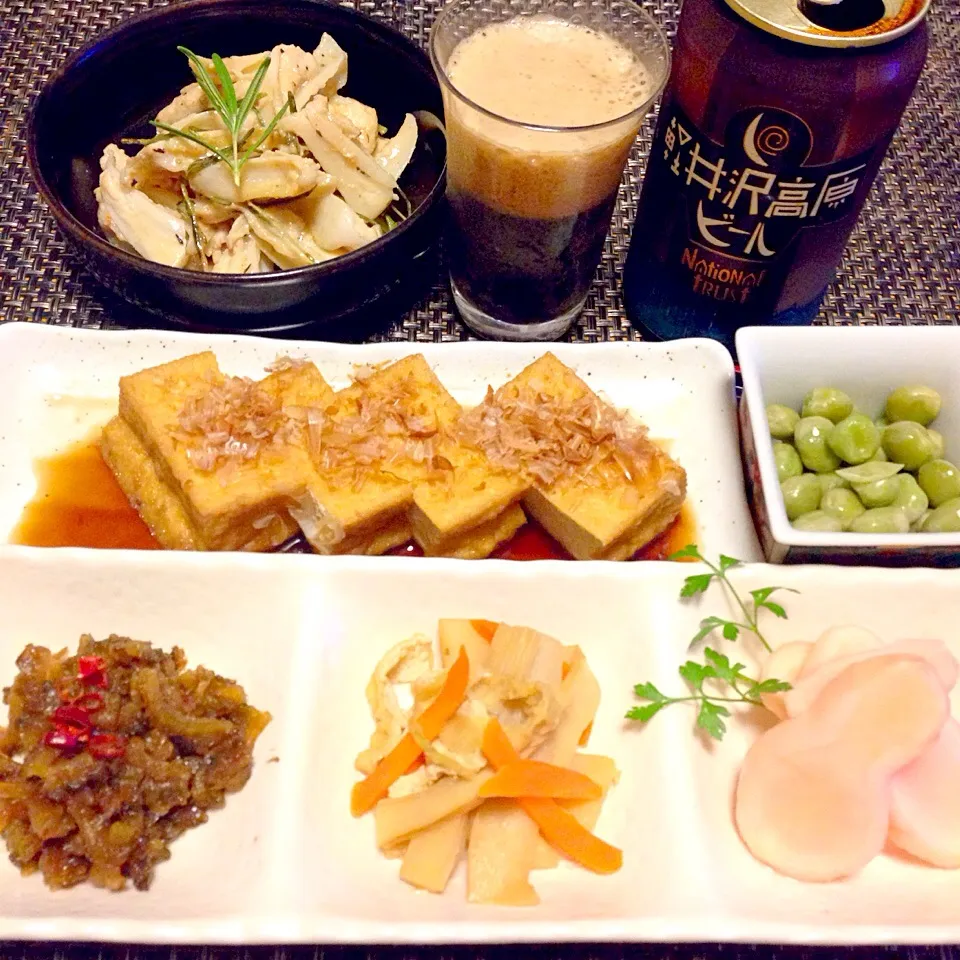帰ってきて、ダッシュでおつまみ作成!!といっても、作ったのは、めんまの煮物!矢弦クレイジーソルト炒め!だけ、後は厚揚げ!ゴーヤ佃煮!叔母の新生姜!青エンドウで乾杯!! #家居酒屋 #宅呑 #手抜料理 #常備菜 #軽井沢高原ビール