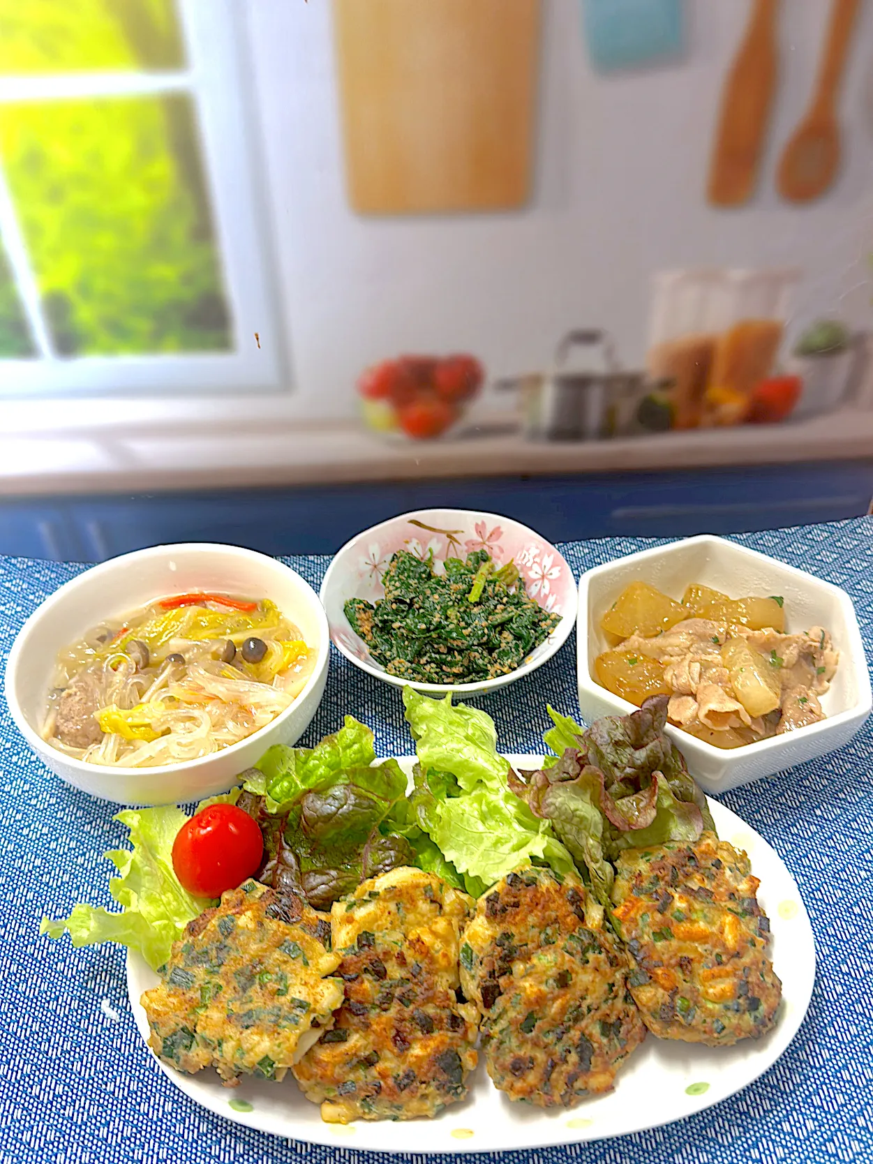 #晩御飯##おうちご飯#うどん餃子#白菜肉団子#ほうれん草胡麻和え#豚大根