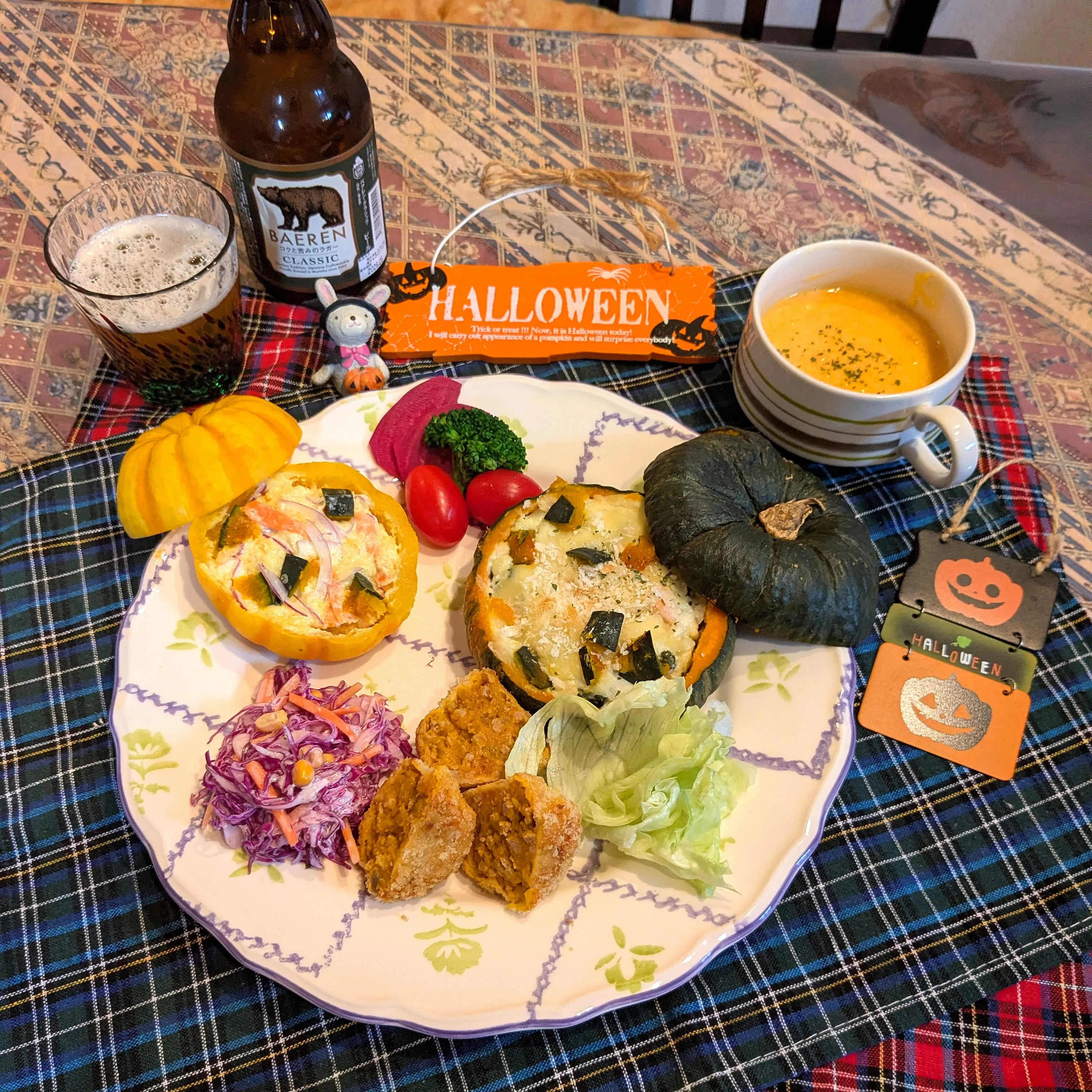 かぼちゃコロッケ、紫キャベツのコールスロー、かぼちゃグラタン、プッチーニ(黄色いかぼちゃ)のサラダ、バターナッツのポタージュ、ブロッコリー、ミニトマト、ベアレンビール🍺🐻💚