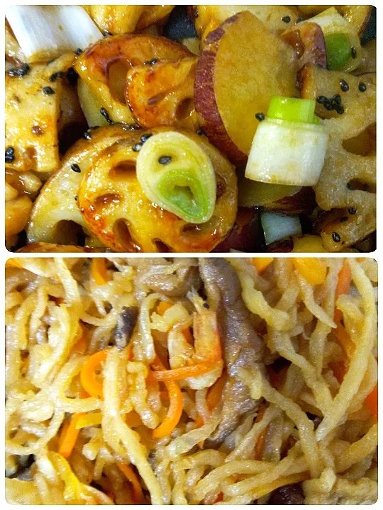 蓮根とさつま芋の甘酢炒め/切り干し大根煮😙長ネギがポイント切り干しには干し椎茸と桜えび😉