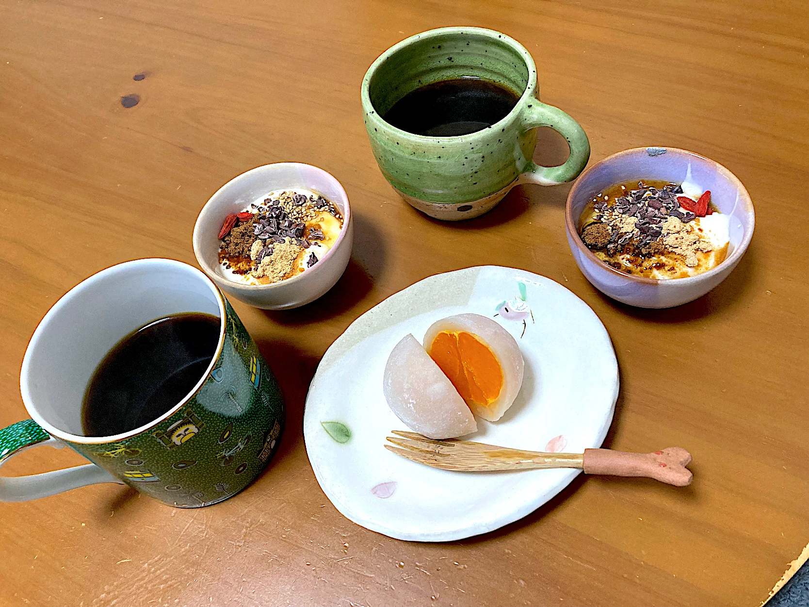 珈琲といつものトッピング盛りだくさん豆乳グルトも。