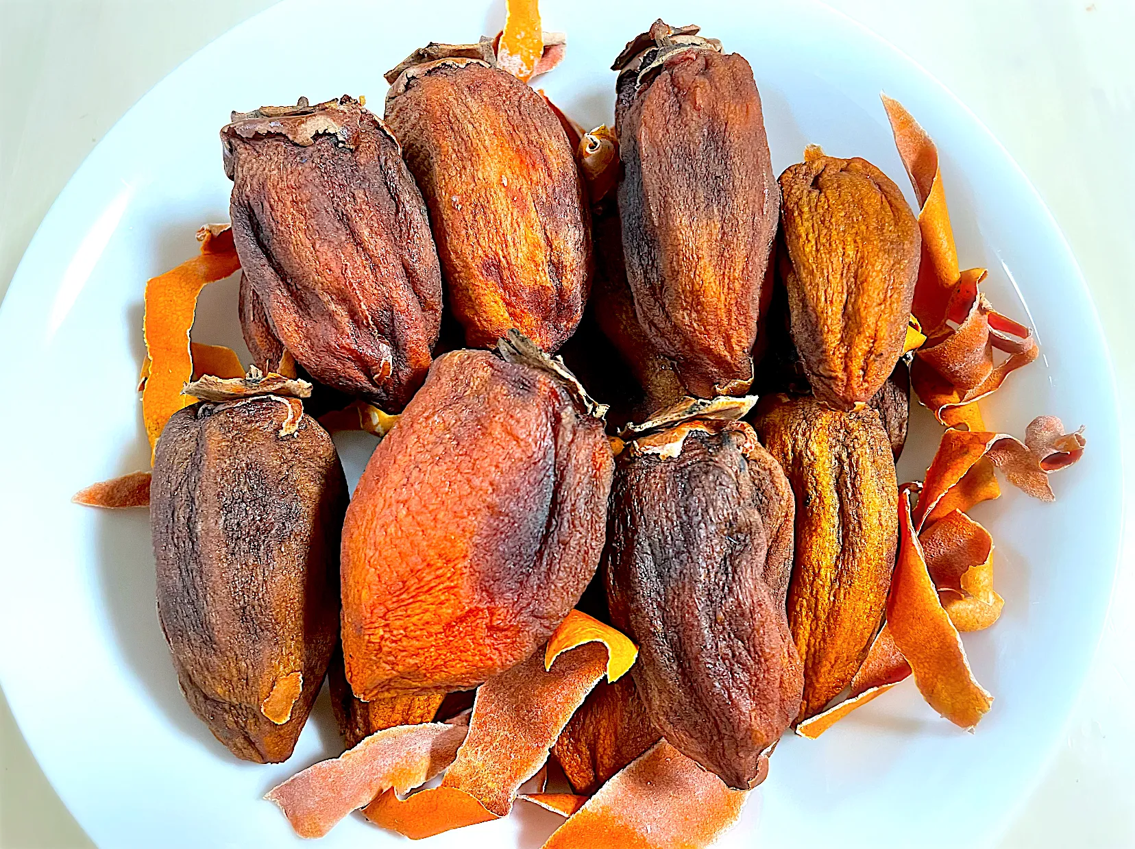 乾燥させた皮も、干し柿と一緒に保存したら白い粉がつくそうなのですが、