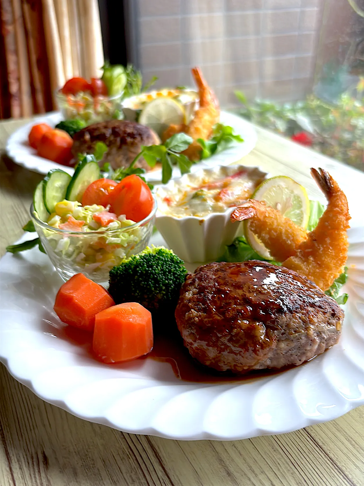 ハンバーグに海老フライにミニグラタン🎶