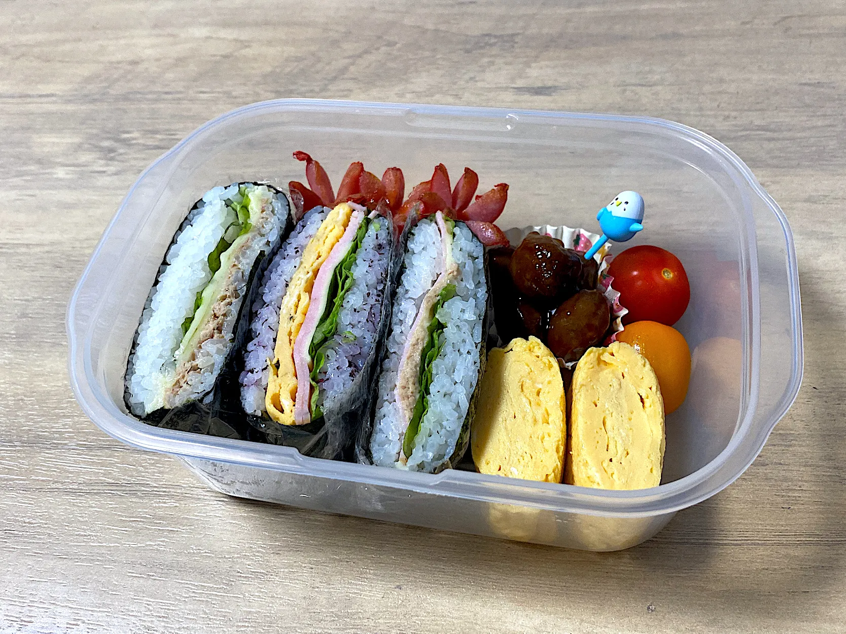 おにぎらず風旦那さん弁当(昨日の甘酢チキンカツ卵味、...