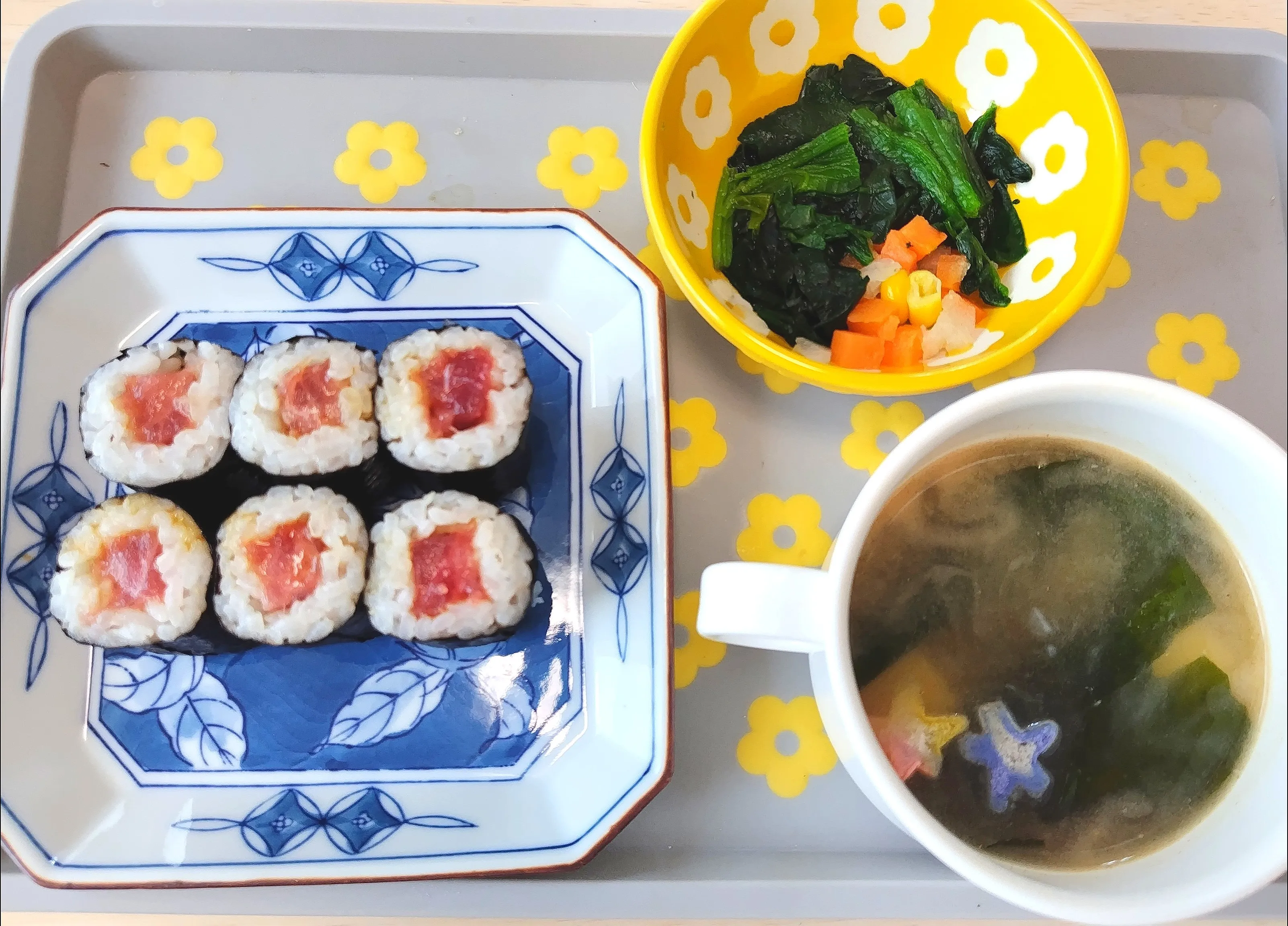 #お昼ご飯#鉄火巻#魚料理 #野菜料理 #お味噌汁#つぶみそ#こどもごはん #いもこども