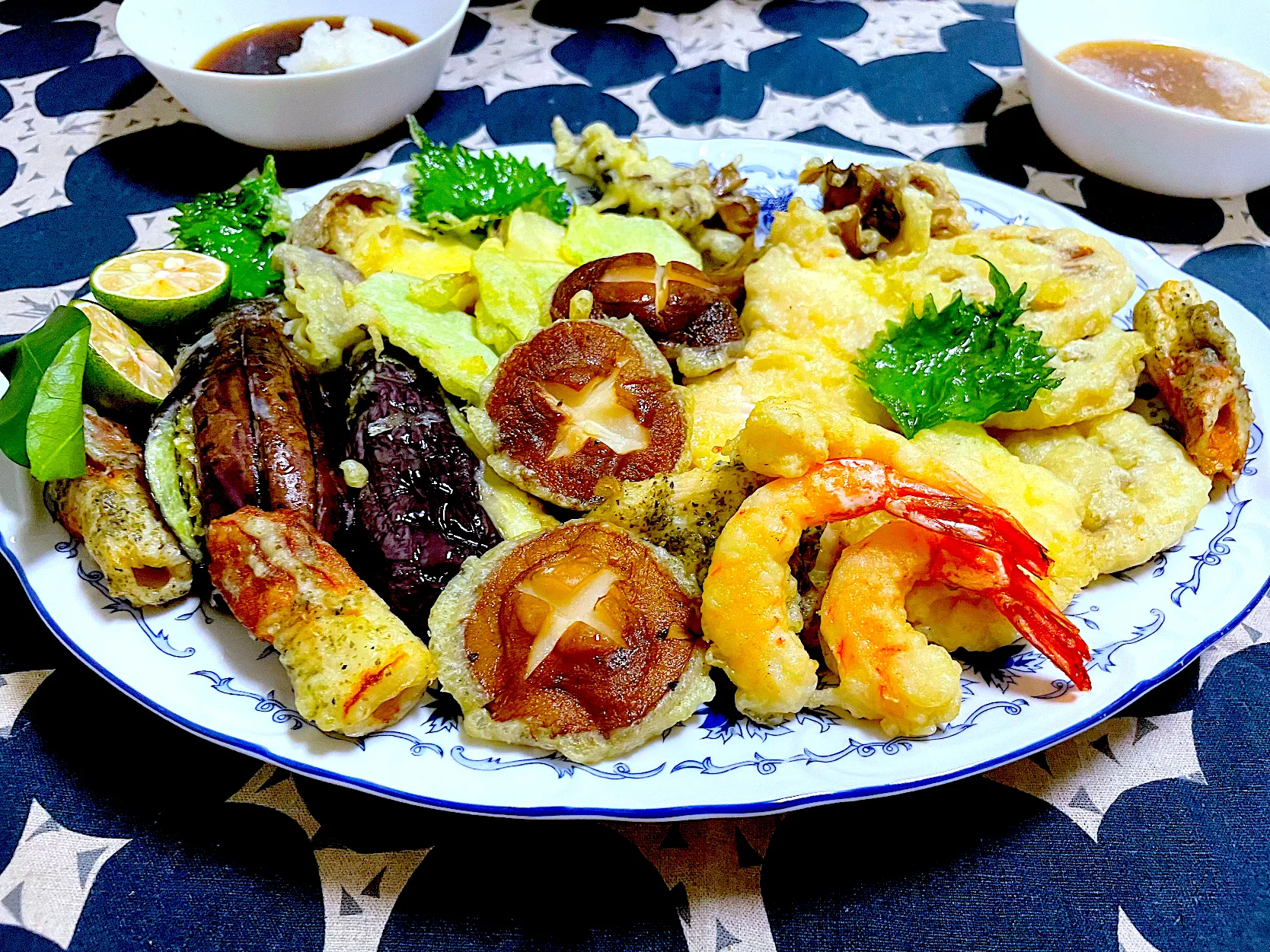 えび、とり天・とり天磯辺、ちくわ磯辺揚げ、大葉、しいたけ、まいたけ、エリンギ、ブロッコリーの芯、なす、レンコン。