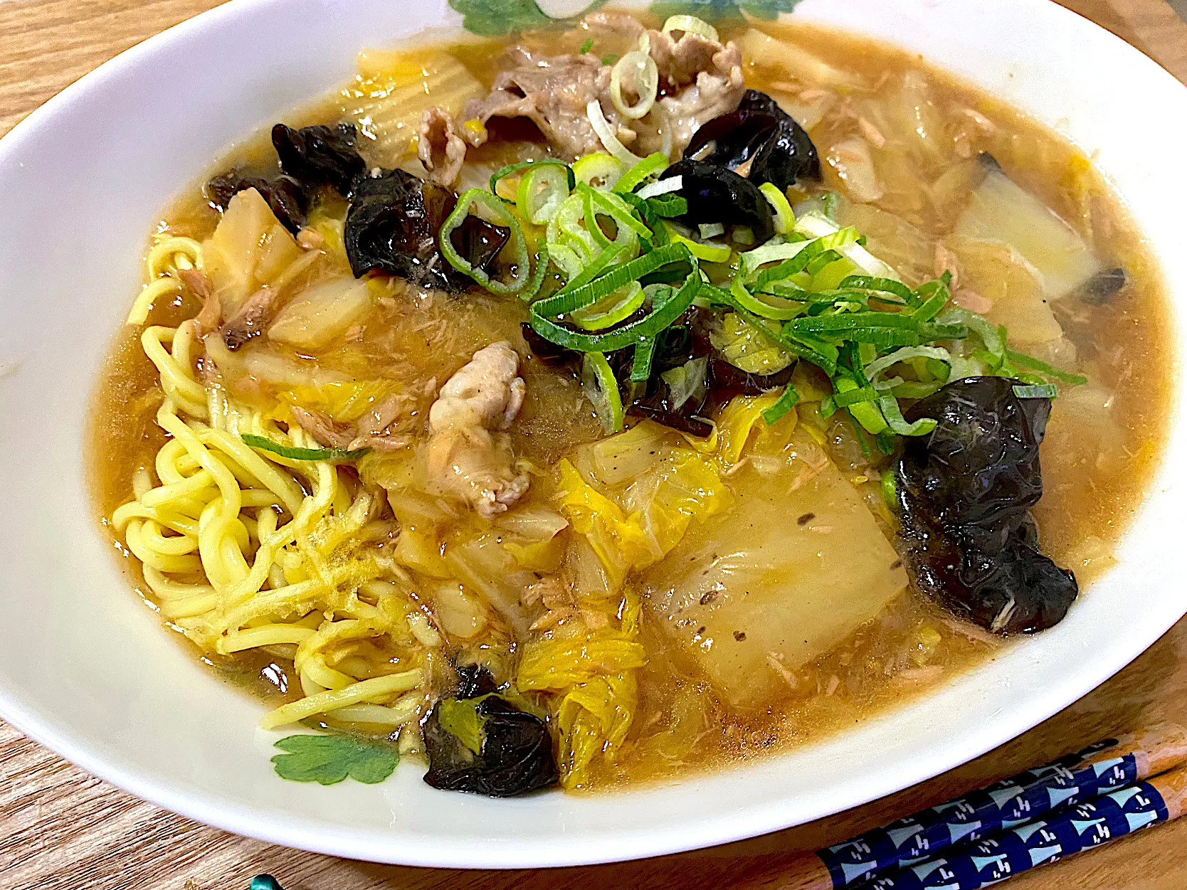 昨晩沢山作った白菜とツナのうま煮をリメイクして餡かけそばにしました🎵 具材は豚肉、キクラゲ、ネギを追加して片栗粉で餡かけに。少し醤油をたらしたら味も引き締まりました😊 これで何とか大量の白菜を使い切れてホッ😅