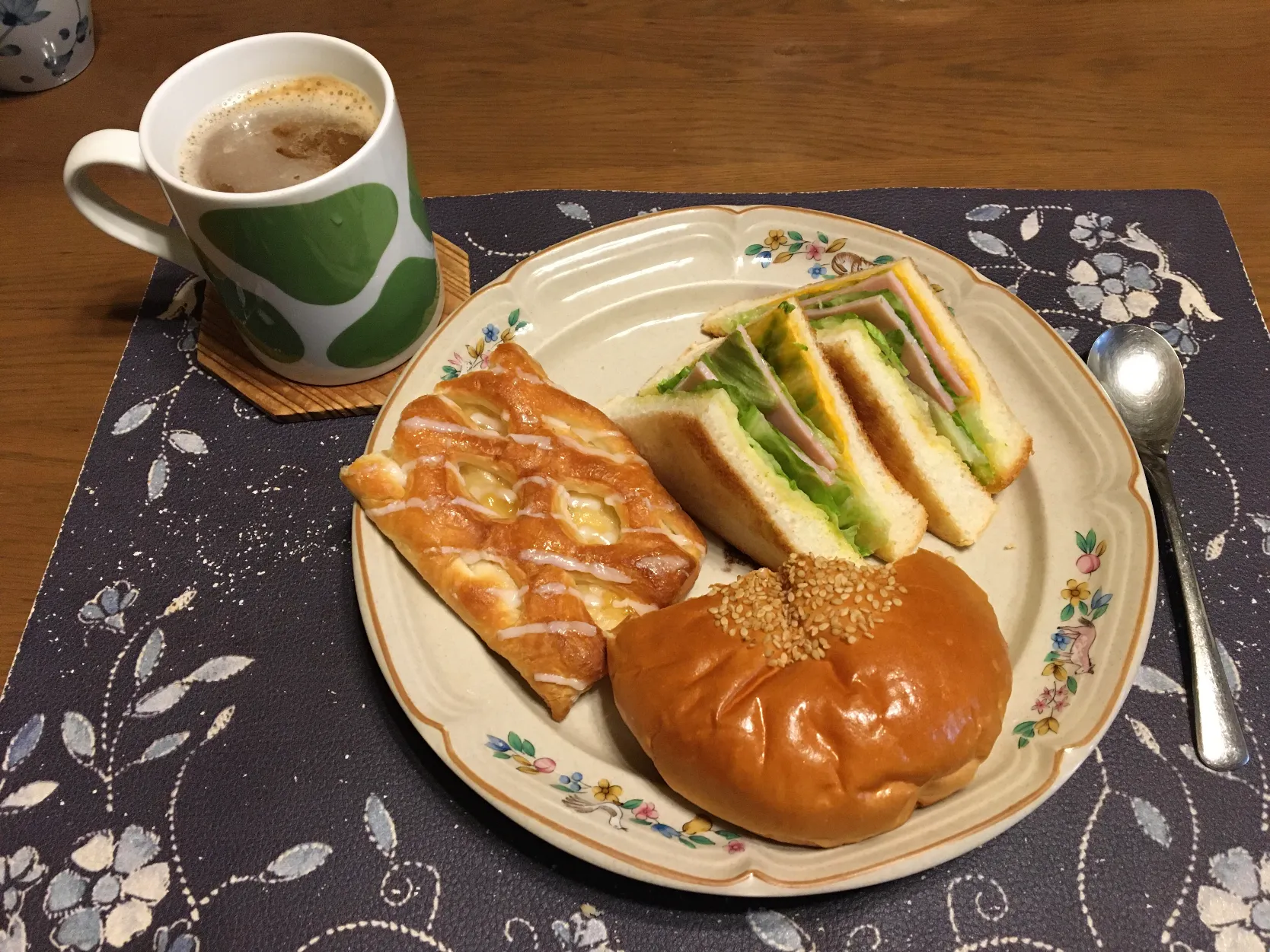 ・トーストサンドイッチ:食パンにマーガリン,マヨネーズ,ねりからしを塗り,チェダースライスチーズ&シュレッドチーズを乗せトースターで焼きレタス&ロースハムを乗せ,向日葵&オリーブオイル&辛味香辛料を垂らし挟む