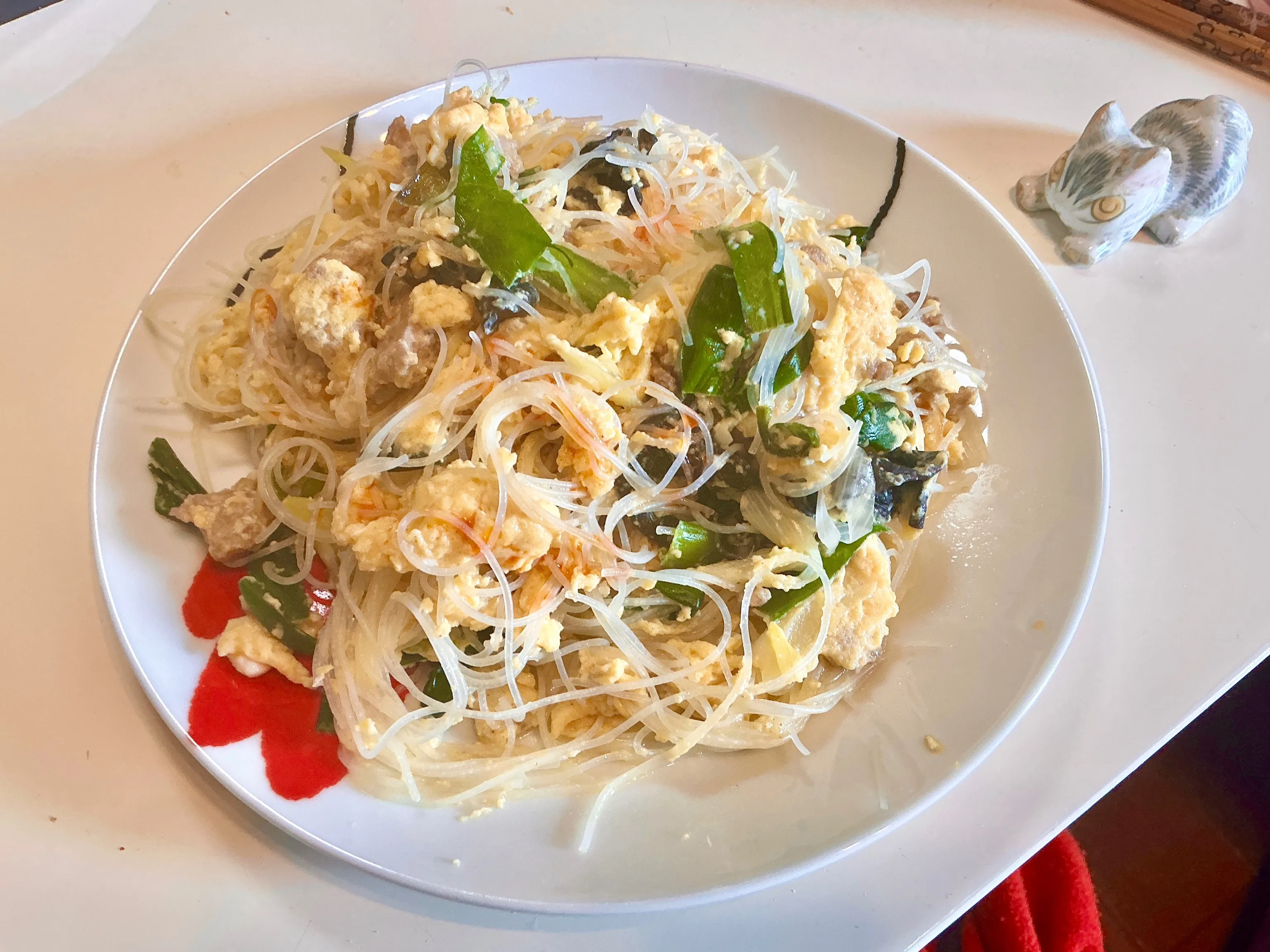 豚ひき肉、ネギ、ニラ、キクラゲで玉子とじビーフン