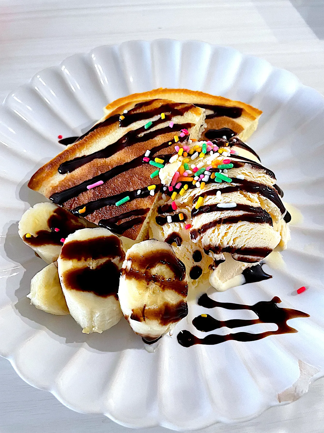 朝食で余ったホットケーキ…おやつにバナナとアイスを添えたらなんかオシャレな感じに^ - ^