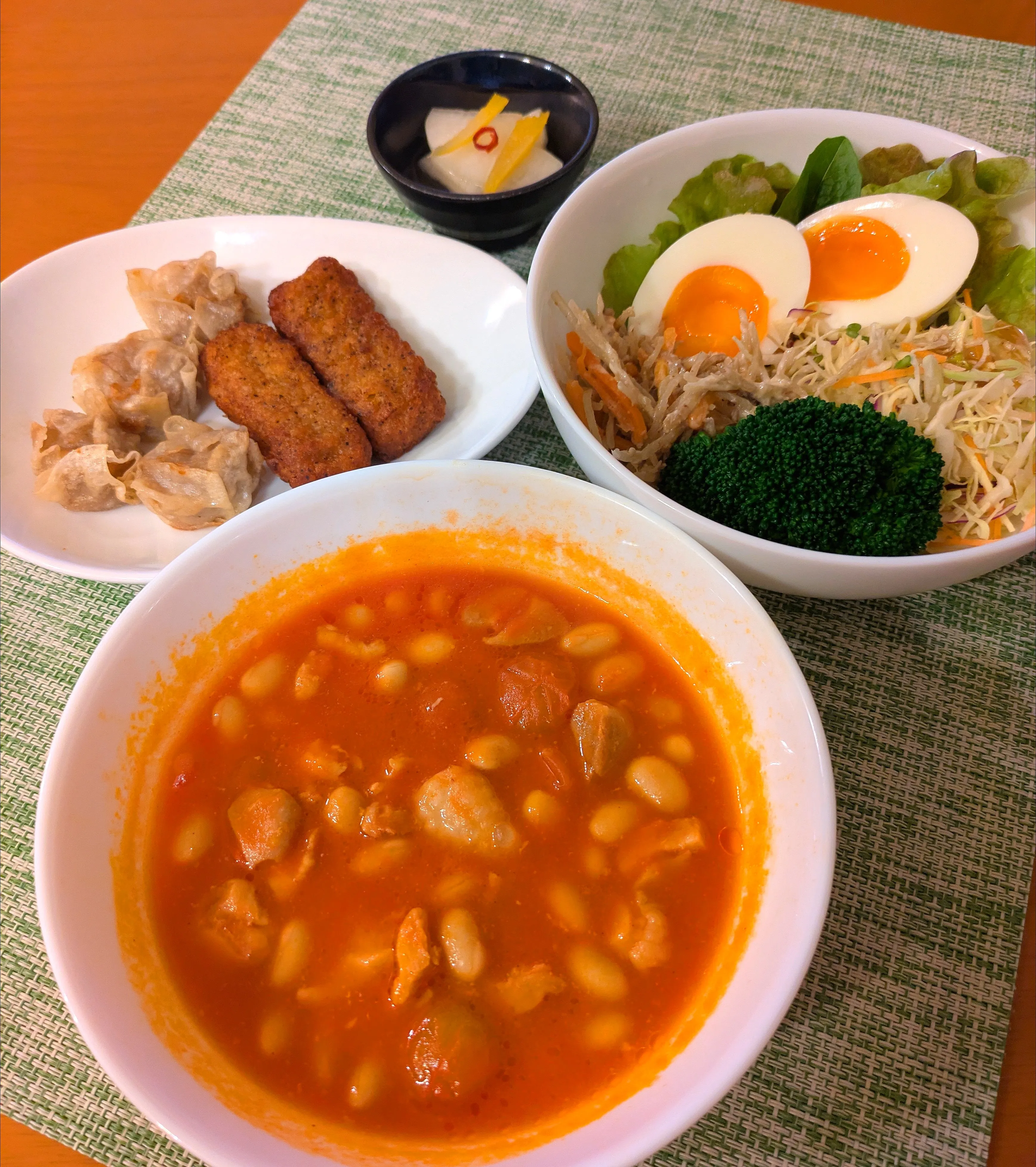 #夕食#チリコンカン#サラダ#シュウマイ#チキンステック#柚子大根