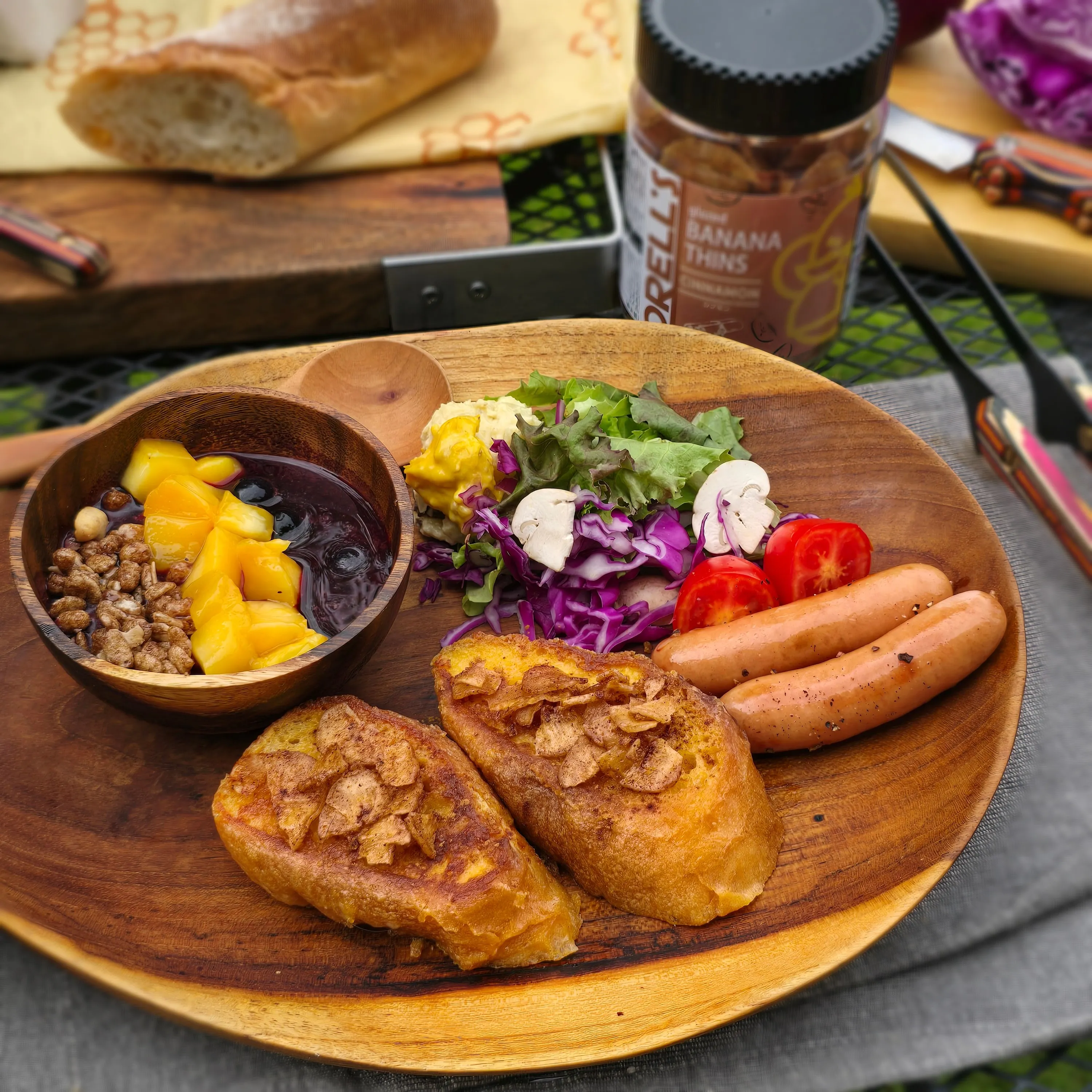 卵液にたっぷり浸しておいたバケットを弱火でじっくりと焼いている間にサラダとアサイーボウルを準備してたらキャンプ仲間に「どこかのモデルのモーニングか!」とツッコまれ😂