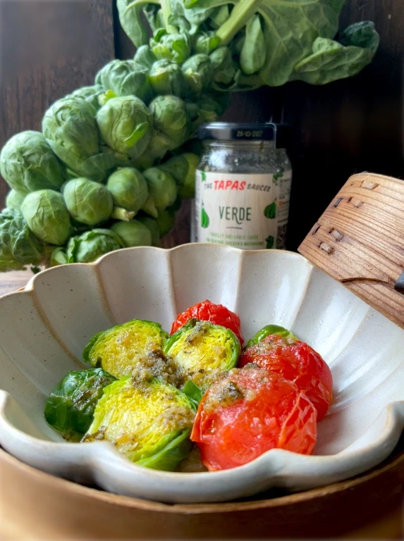 芽キャベツとミニトマトを蒸籠で蒸して、タパスソースヴェルデをかけていただきました🧑🍳