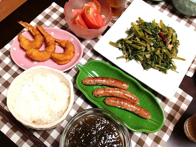 貰い物ディナー★上司がくれたトマト、先輩がくれた北海道のソーセージ、おばあちゃんがくれた福井産もずく、あとは海老フライと空心菜炒め