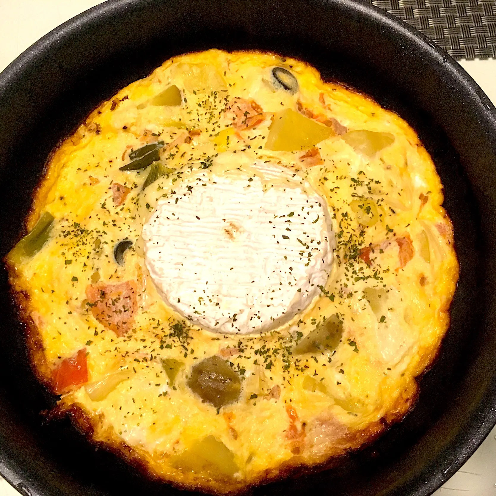 #スパニッシュオムレツ #カマンベールチーズ入り #リメイク #下仁田ねぎ #じゃがいも #パプリカ #オリーブ