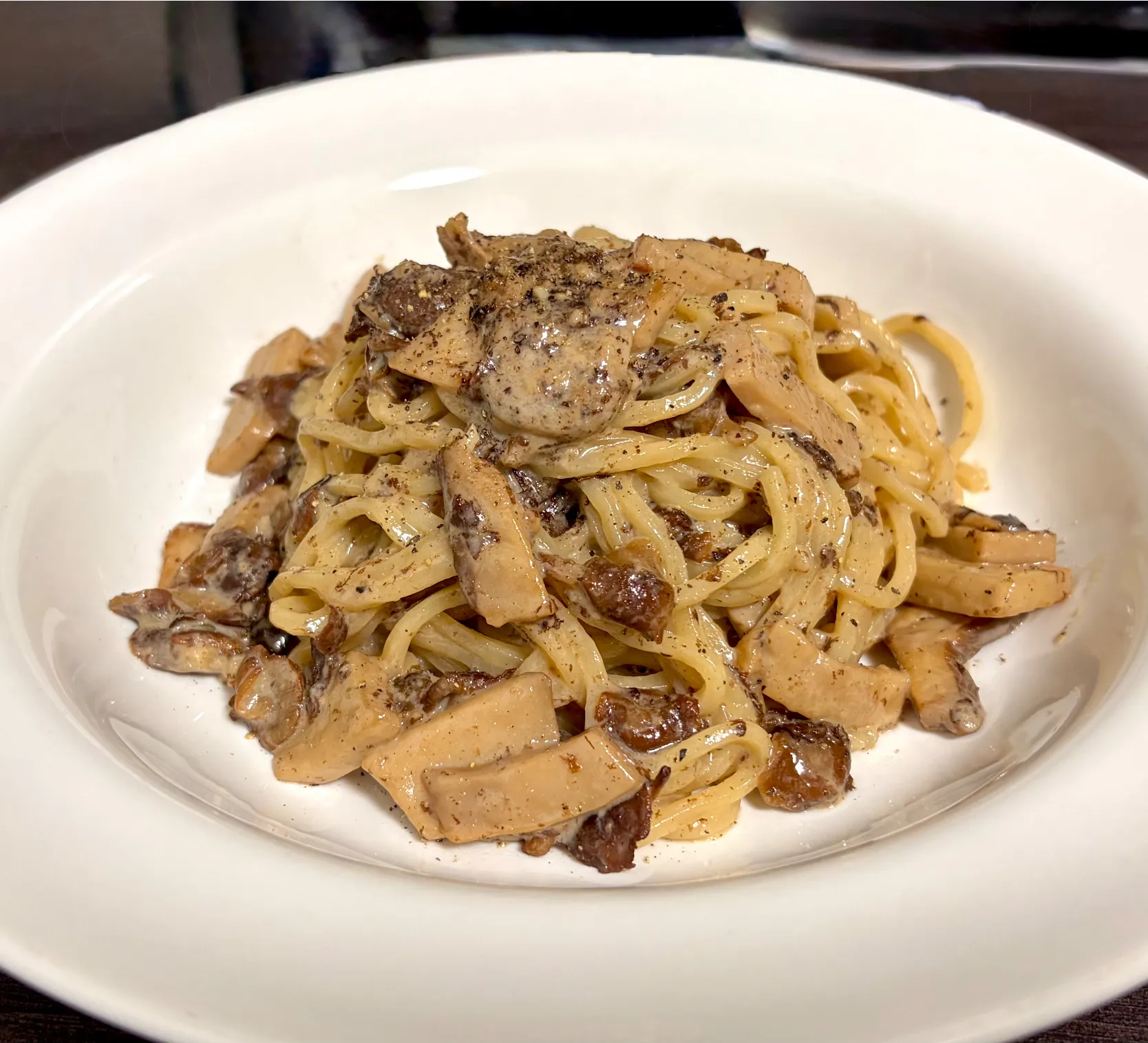 最近SNSで流行りの、なめこをよくソテーしてポルチーニみたいな香りがするクリームパスタを作ってみました🍝 美味しい