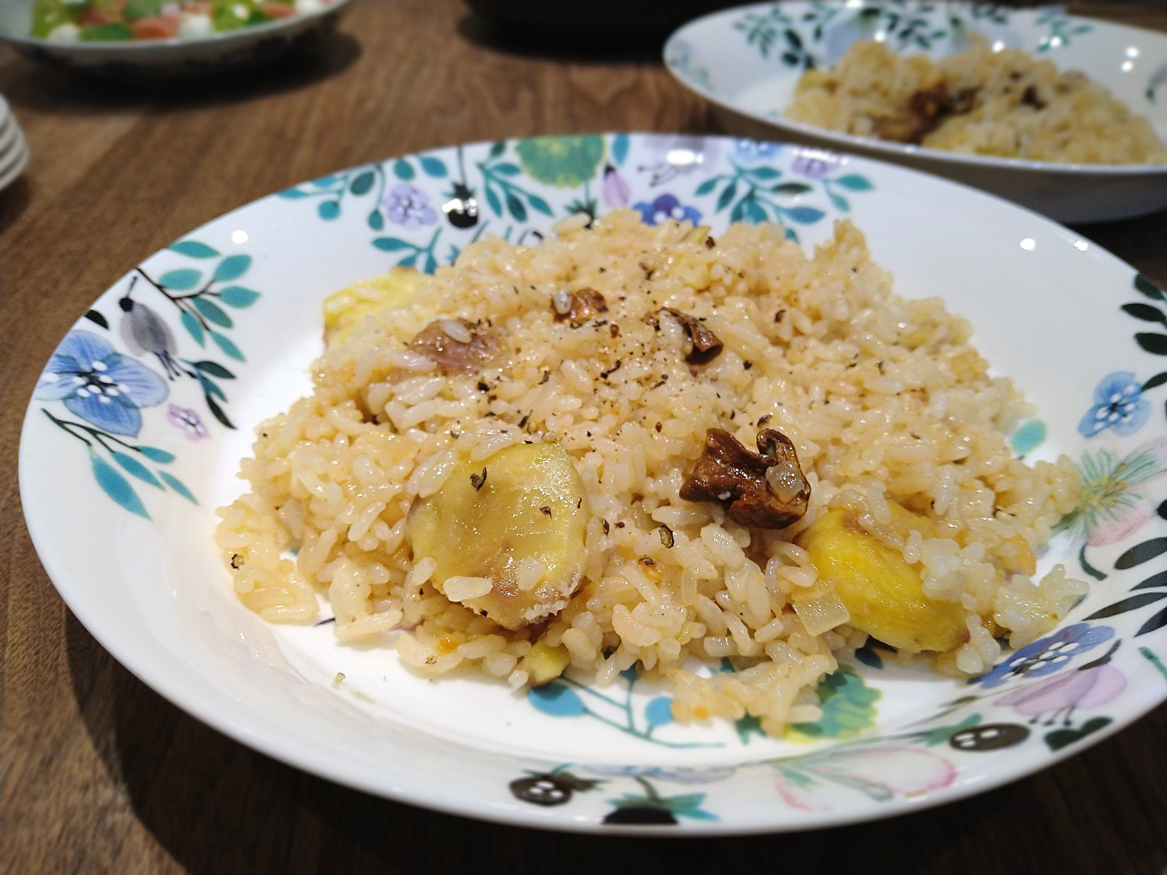 玉ねぎ にんにく ポルチーニを炒め 軽く洗いオリーブオイルを絡めたご飯 茹で栗を加え ブイヨン ポルチーニの戻し汁でさっと煮て パルメザンチーズを混ぜるだけ
