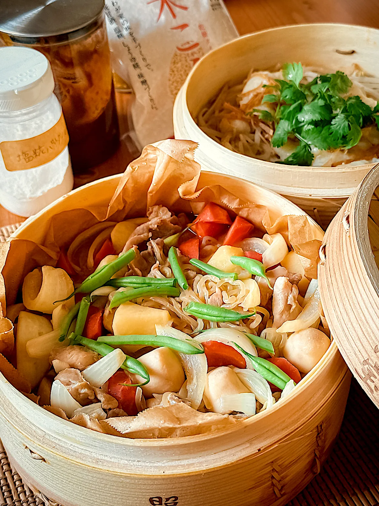肉じゃがはちょっと具を欲張りすぎたのか、人参やじゃがいもに火が通るのに時間がかかっちゃったけど、蒸籠で蒸すとお野菜に蒸籠の香りがほんのりうつり、それがまたほっこり感を増幅させてくれるし、なんだろ、出来上がりのお野菜の水分量というのかな(* ᐕ)?それがえぇころ具合なんですよね😋