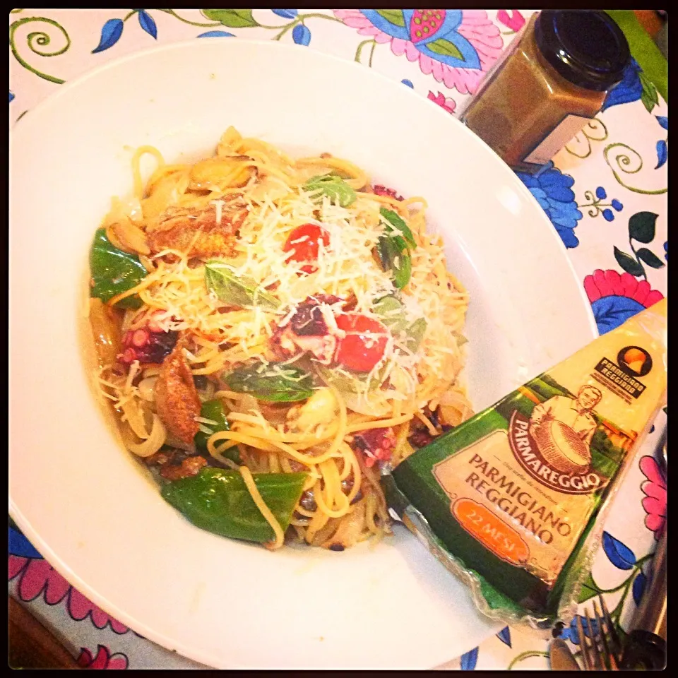 タコとムール貝、オイルサーディン、お庭のアイコ&バジルのアーリオオーリオバベッティーニ。イタリアのお土産、パルメジャーノレジャーノがけ。
