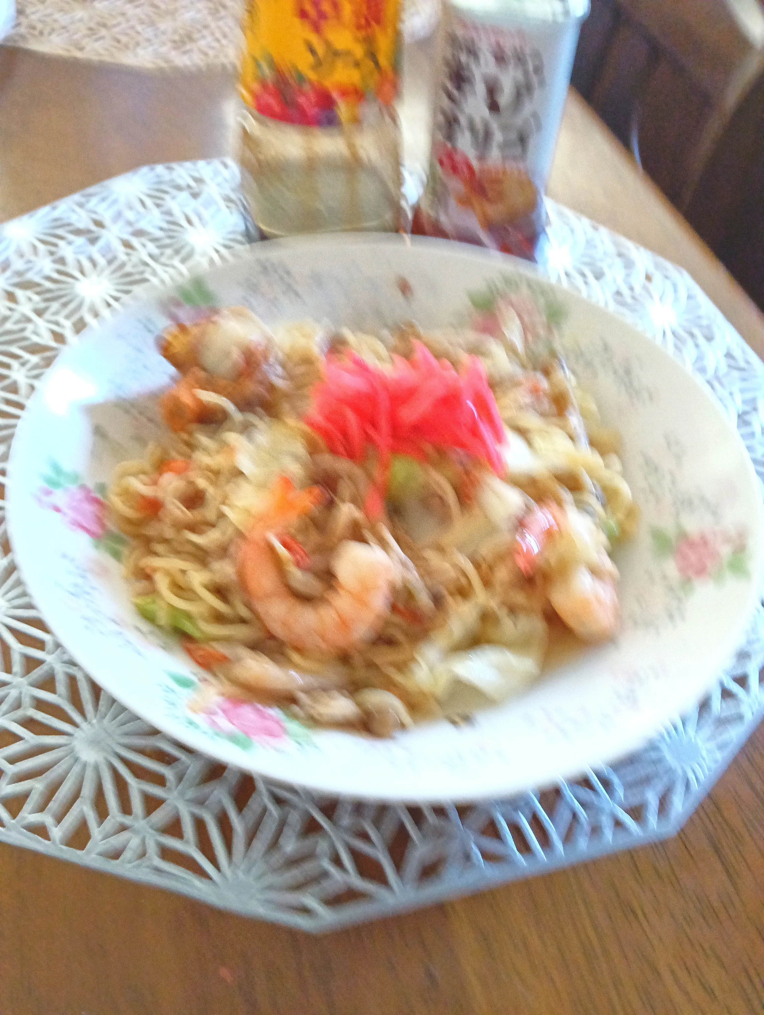 ホタテ・エビを加え炒める水を30cc入れ、塩・胡椒さらにソース・きびオリゴを入れ炒める