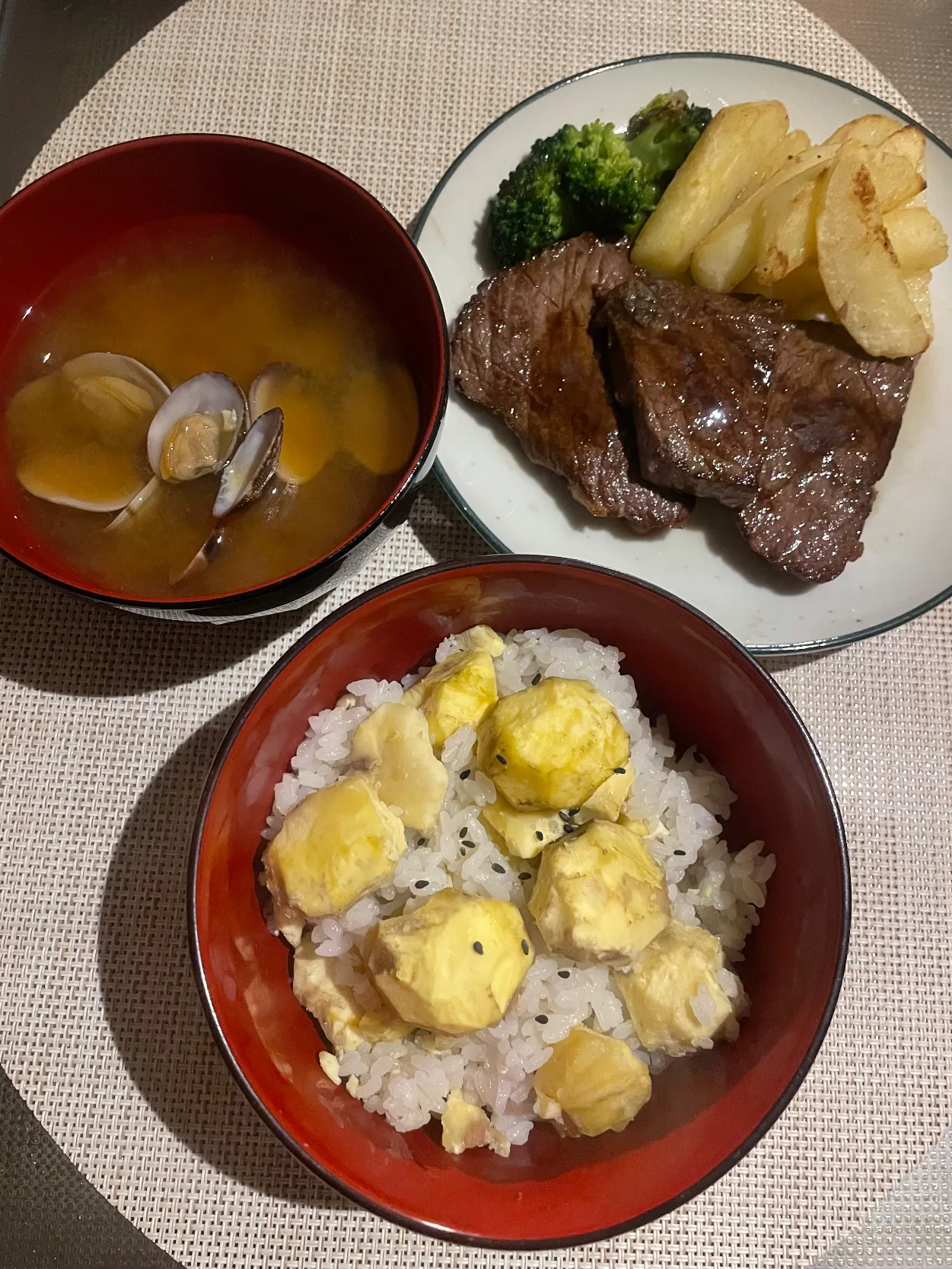 #今日の晩ごはん#栗ごはん#アサリのお味噌汁#ヒレステーキ#ブロッコリーとポテト#私のおいしい写真