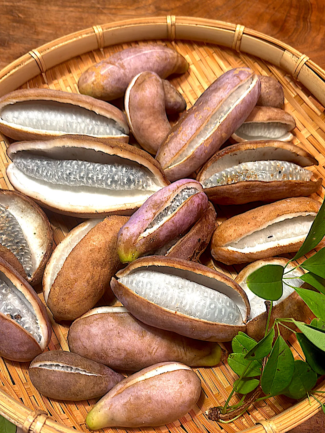アケビの皮の中に鶏のテリーヌと柿のジュレ 無花果のせ