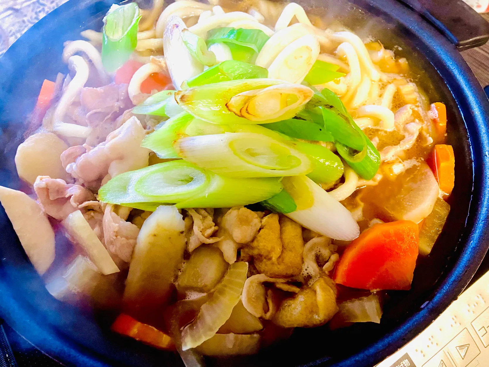 #にんじん #ねぎ #しいたけ #ごぼう #里芋 #油揚げ #豚バラ #れんこん #うどん #大根 #鰹だし #だし醤油