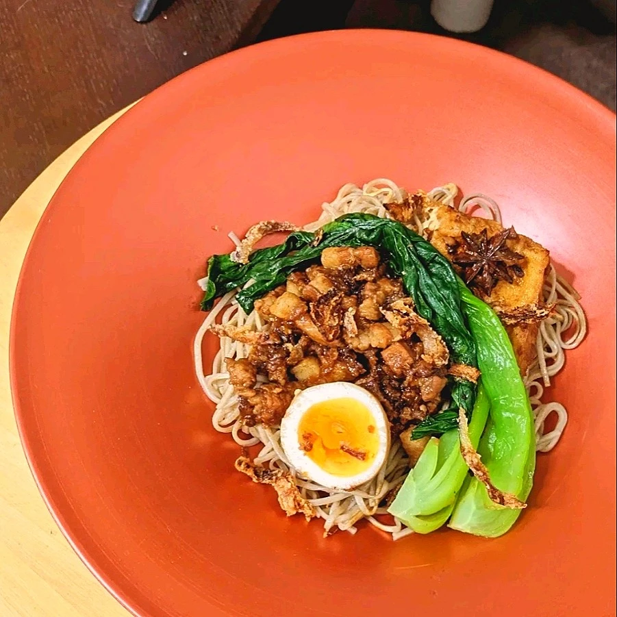 #変わり種 #年越しそば #魯肉麺 #生麺 #日本そば #厚揚げ #味玉子 #青梗菜 #紫玉葱 #フライドオニオン #五香粉 #八角 #紹興酒 #三温糖 #オイスターソース #九州甘口 #醤油 #クラッシュナッツ #コーヒー粉 #焼き魯肉麺