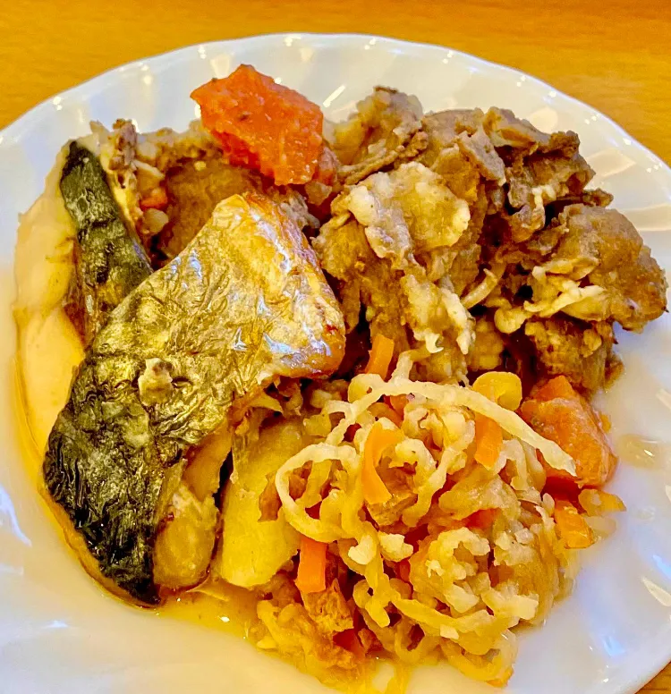 「残ってた 常備菜」💦 冷蔵庫やフリーザーの常備菜 油揚げと小松菜の味噌汁を添えて 朝ごはん・・