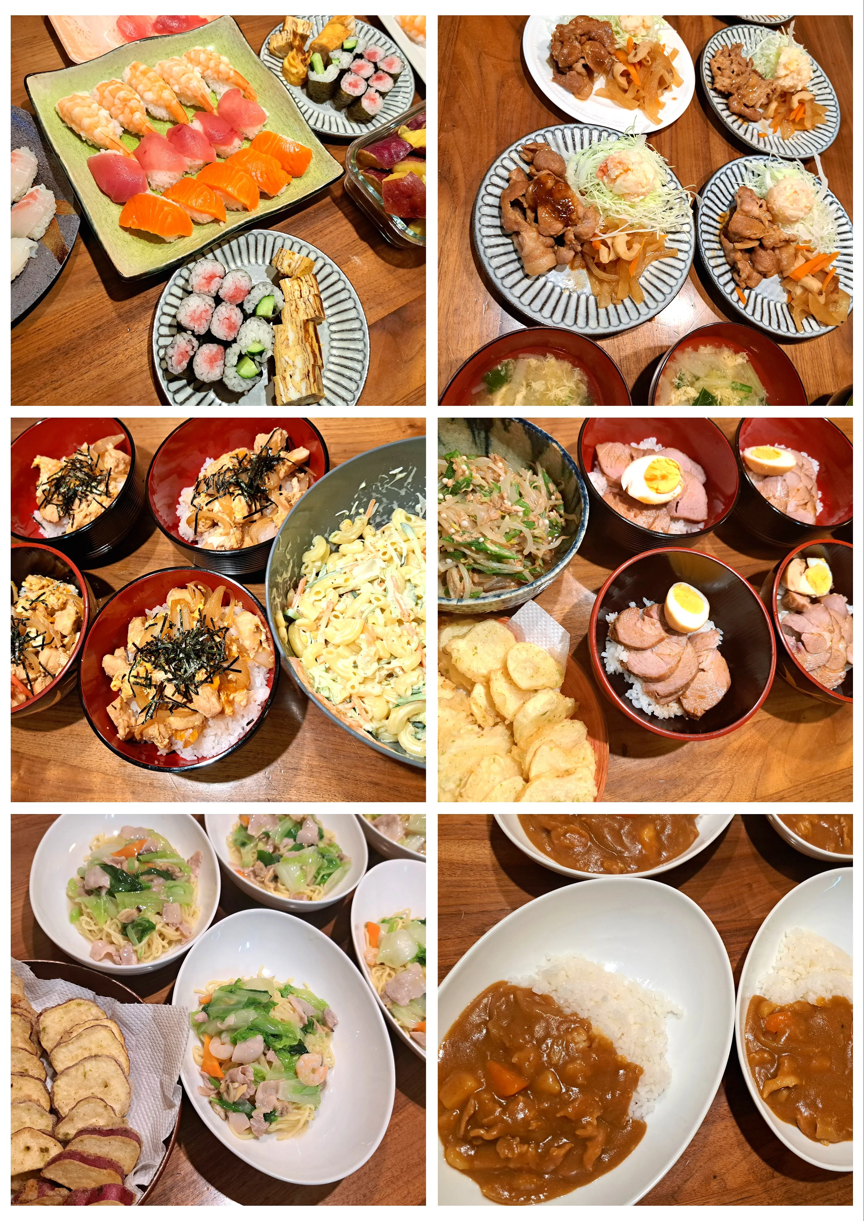 ●家族みんなで手作り寿司、さつま芋甘煮●豚肩ロースのしょうが焼き、大根きんぴら、タラモサラダ、かき玉汁●親子丼、マカロニサラダ●煮豚丼、じゃが芋天、ツナオクラもやしサラダ●五目あんかけ焼きそば、さつま芋天●カレー