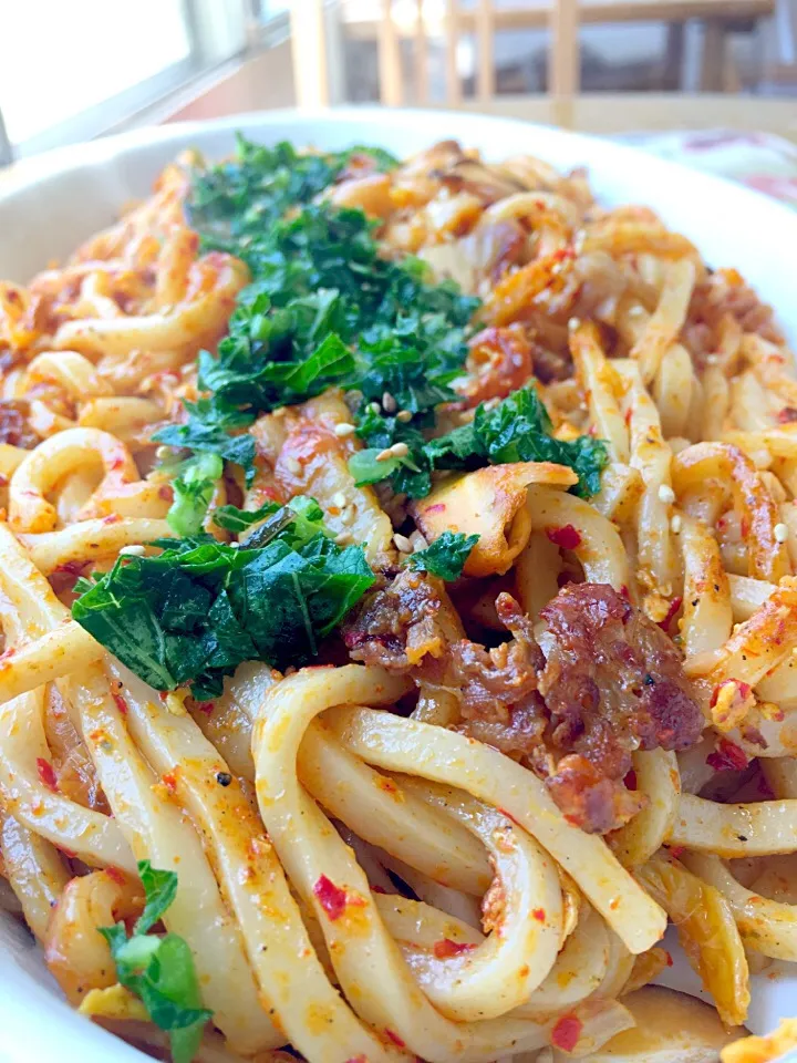 夜勤明け手羽中のチーズダッカルビ風焼うどん