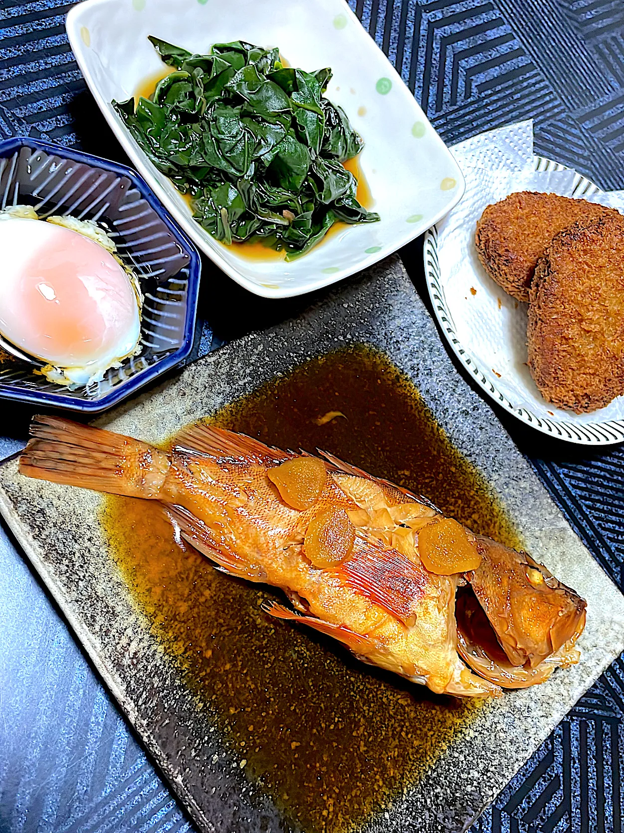 おかわかめ コロッケ 温玉 メバル煮付け #お酒 #小鉢 #健康 #お家居酒屋