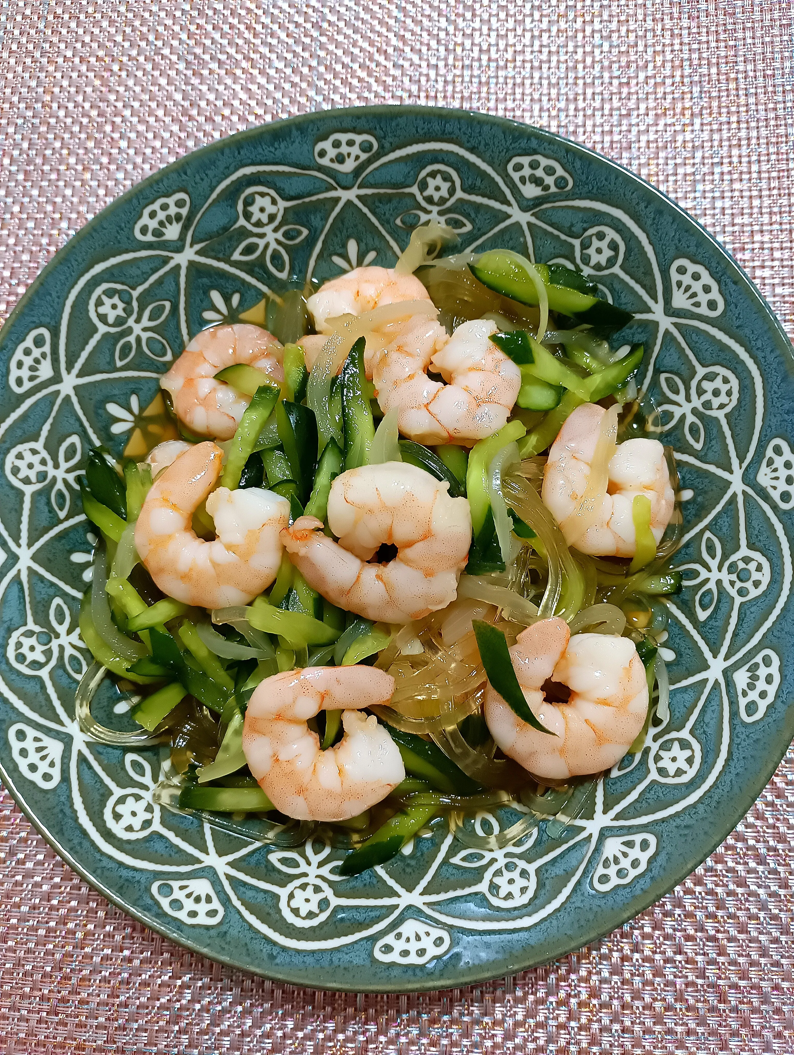 海老ときゅうり、葛きり、玉ねぎをナンプラーやレモン汁、砂糖で味付けしました