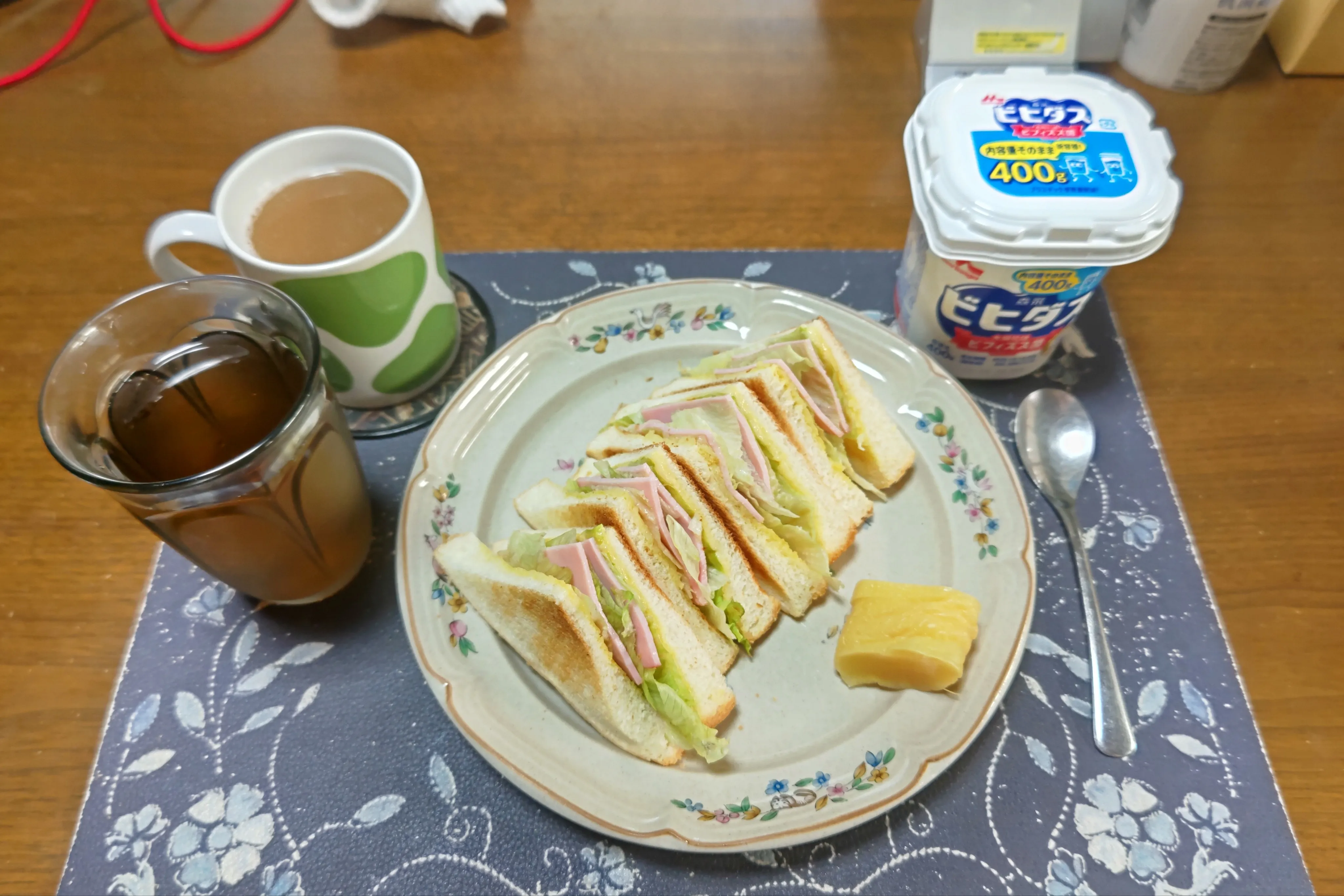 ・トーストサンドイッチ:食パンにマーガリン,マヨネーズ,ねりからしを塗り,シュレッドチーズをのせてトースターで焼き,向日葵&オリーブオイルと辛み香辛料を滴し,レタスとロースハムを挟む