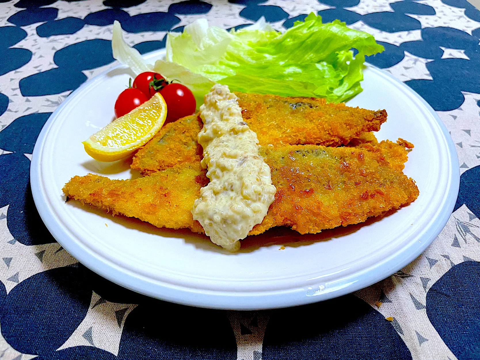 冷凍しておいた衣つきのアジを揚げただけ〜