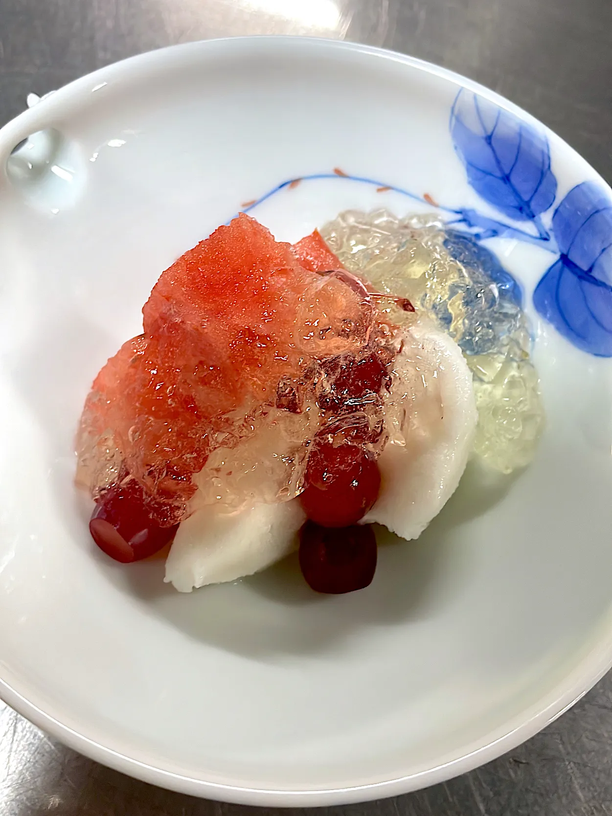 • 青梅の甘露煮,赤紫蘇の寒天、びわゼリー射込み、梅のシャーベット、飾りにワイルドベリー|hotsusan30さん