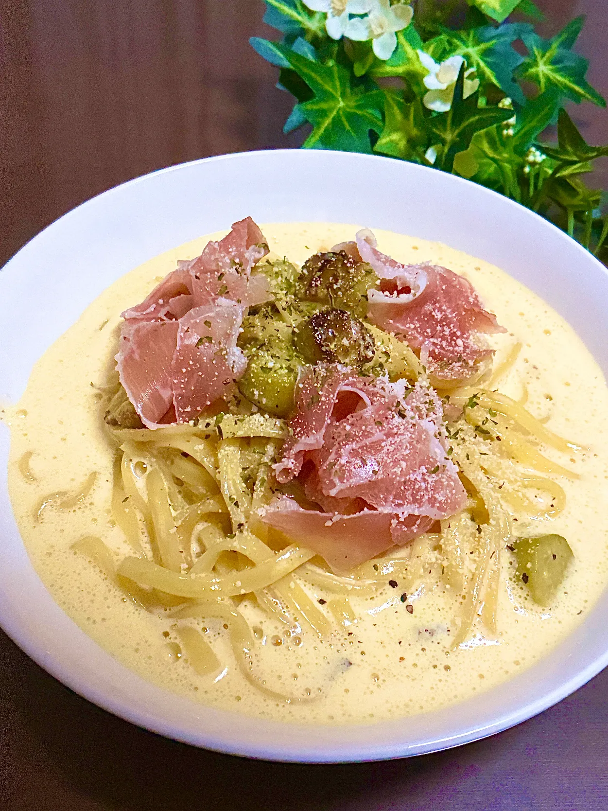 いつもとはちょっと違うけどおいしいカルボナーラになりました☺️