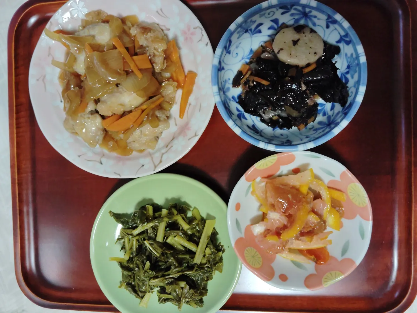 #油淋鶏#大根菜#あらめ#人参#長芋#柚子#柿#無花果