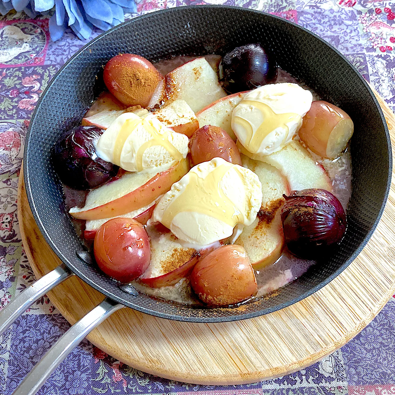フルーツたっぷりスキレットで焼いてアイスにシナモンと蜂蜜かけました😄