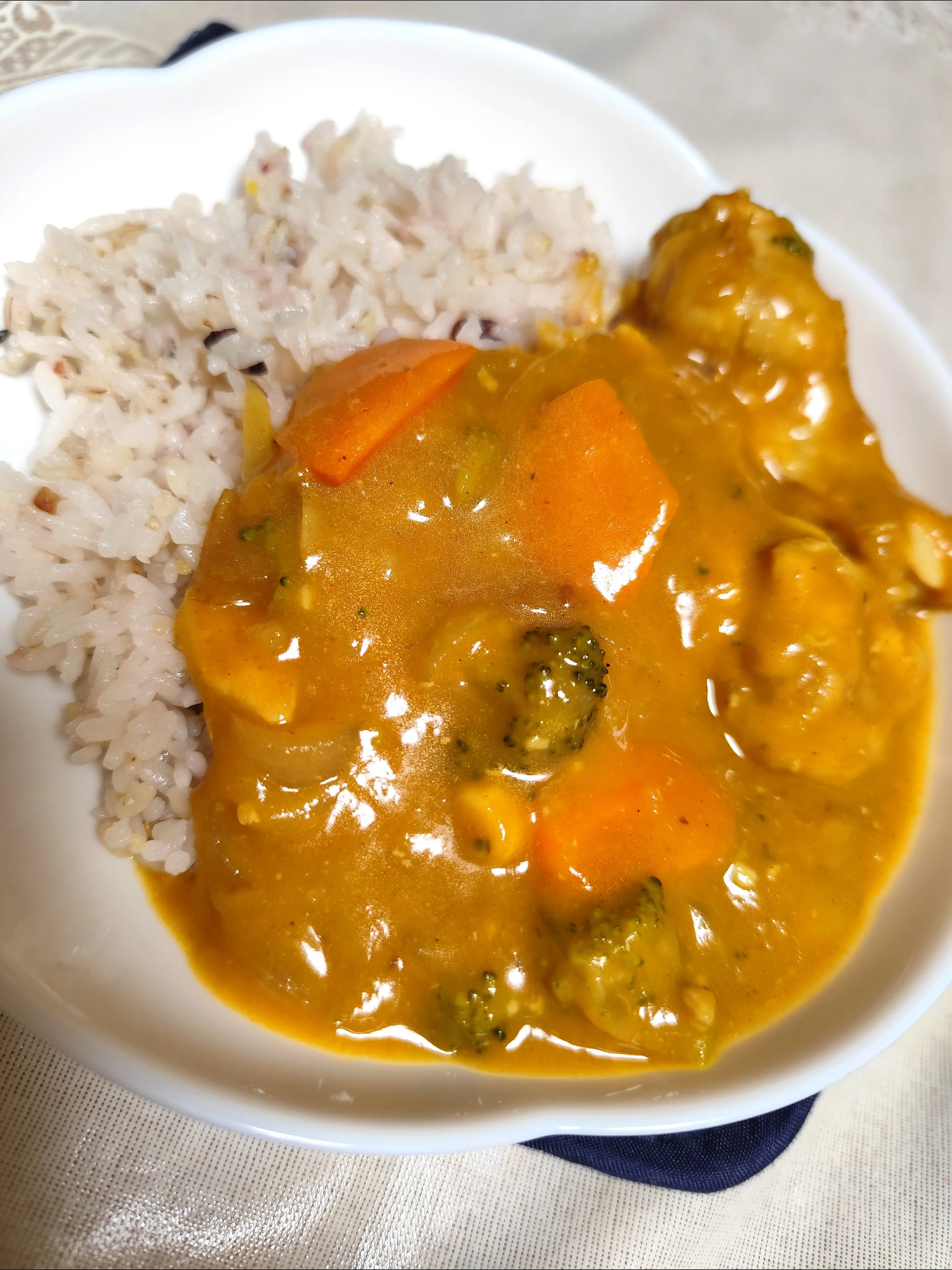 手羽元を骨の近くに沿って切り目両方入れ、にんにくしょうが生塩糀を揉みこみ置いてから使いました!!玉ねぎたくさん、人参、さつまいも、冷凍ブロッコリーの具材で、スパイスはコリアンダー、クミン、ガラムマサラ、SBカレー粉赤缶、甘口ルー。最後牛乳も。