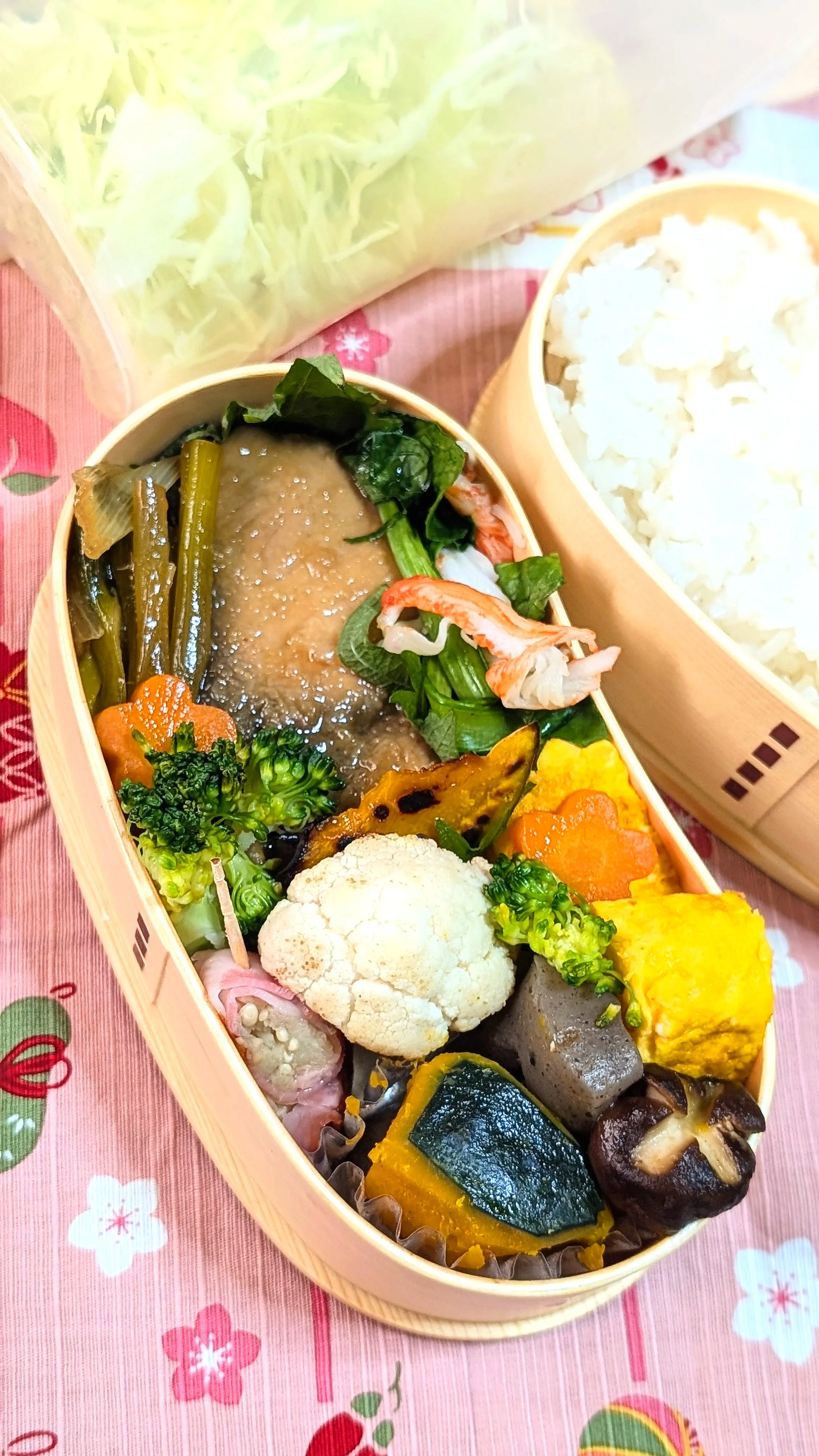 カボチャやカリフラワーやブロッコリーで彩り綺麗なお弁当ですね゚+.゚(´▽`人)゚+.゚✨