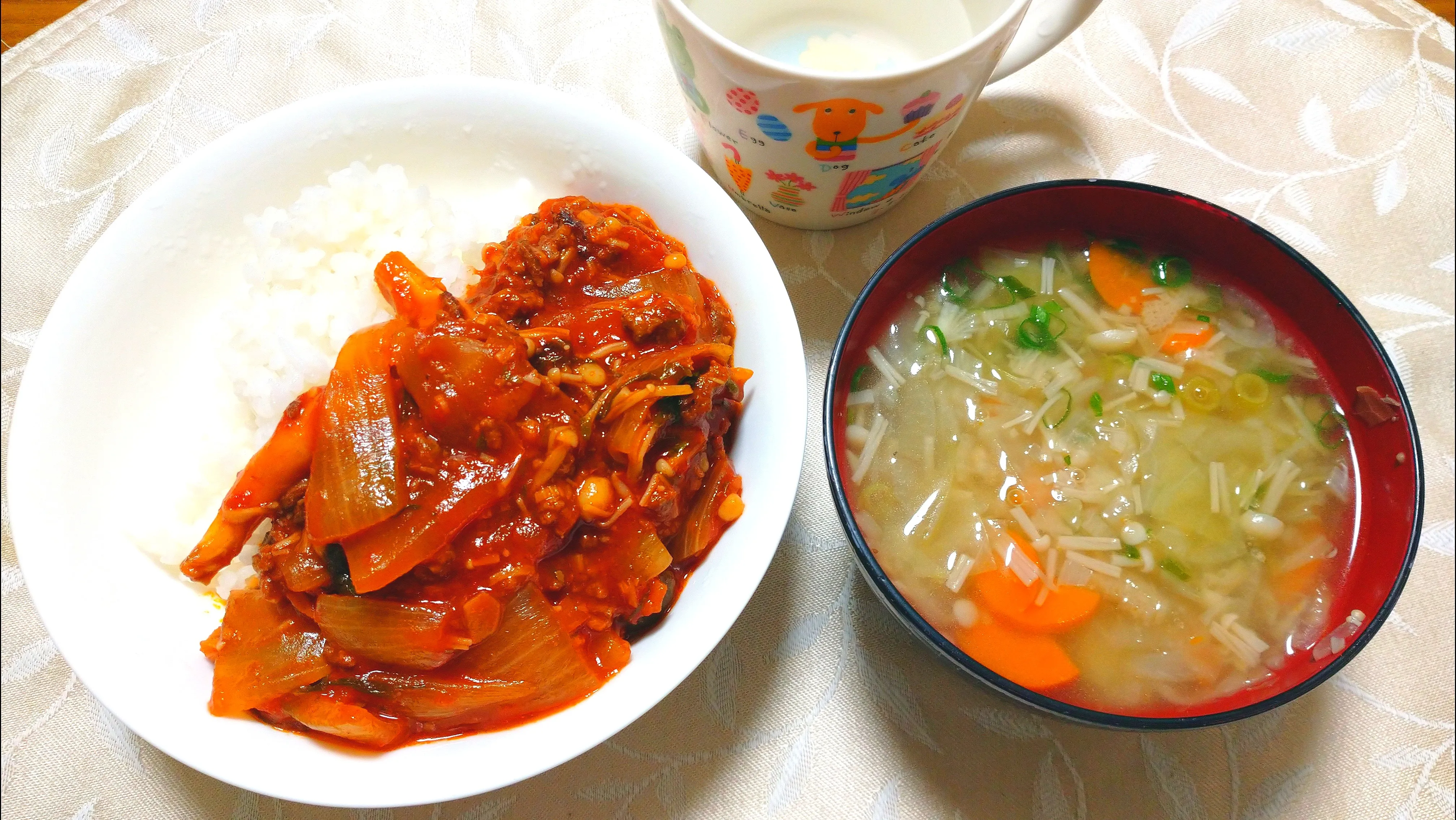 パントリーの備蓄していたトマトソースとひき肉、玉ねぎで簡単ハヤシライスを作りました。