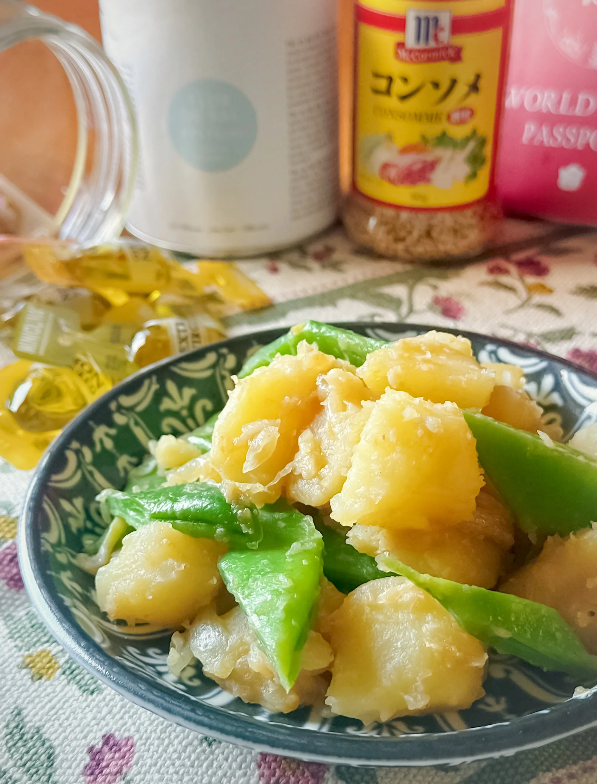 まるでラピュタ🏰の呪文のような名前だか、要は緑のってことで、鞘付きの緑のお豆とじゃがいもの炒め煮です(๑•̀ㅁ•́ฅ✧