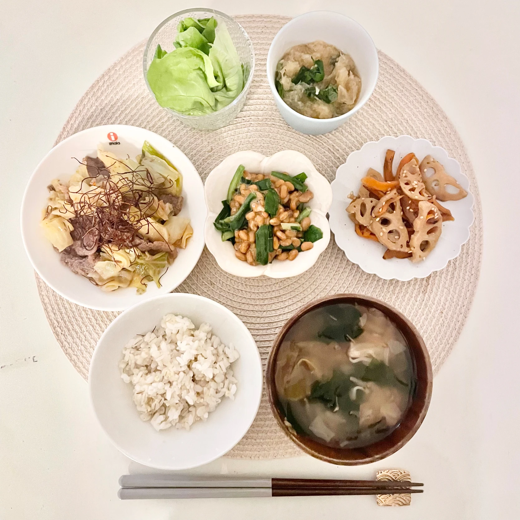 #牛肉とキャベツの炒め物 #れんこんとにんじんのきんぴら #大根と大葉のポン酢和え #ニラ納豆 #サラダ #みょうがともやしのお味噌汁 #麦ごはん