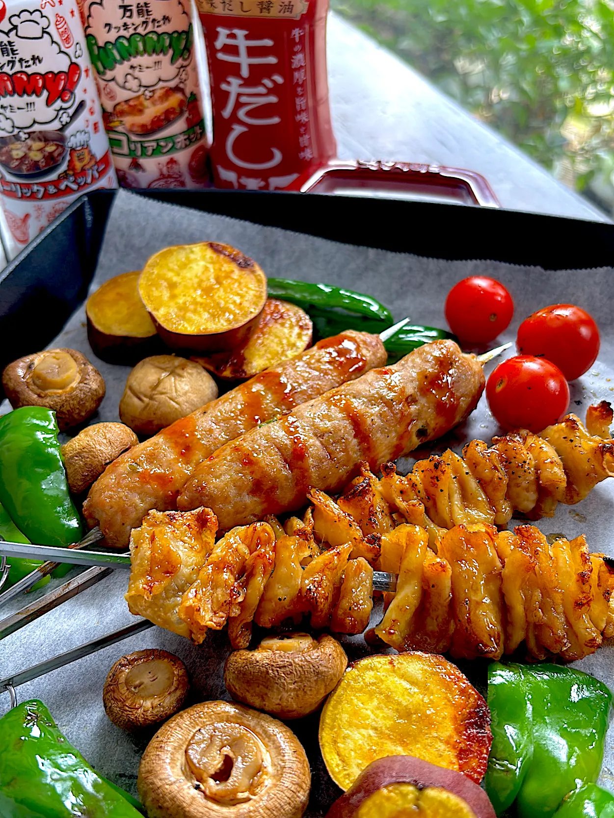 鶏皮&つくねにピーマンやミニトマトやさつまいも,マッシュルームで秋らしい和風ケバブでキャンプ飯😆✨