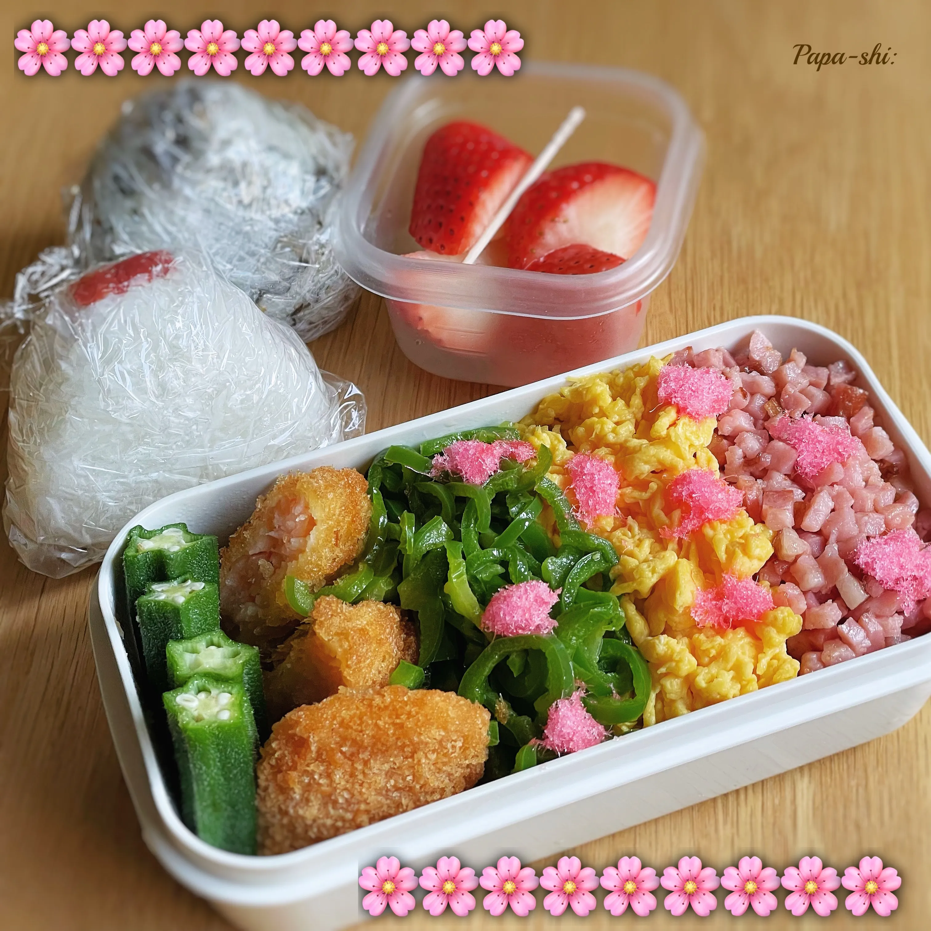 と桜咲くようにの思いで桜でんぶをちらした、特製の3色弁当です