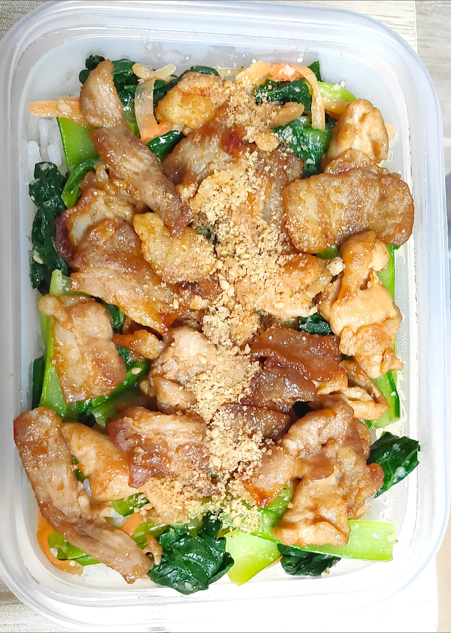 小松菜とにんじんのナムルの上に焼肉タレとコチュジャンで炒めた豚肉です。